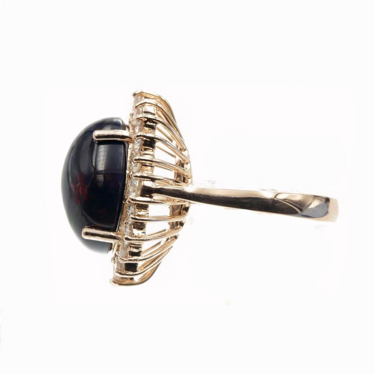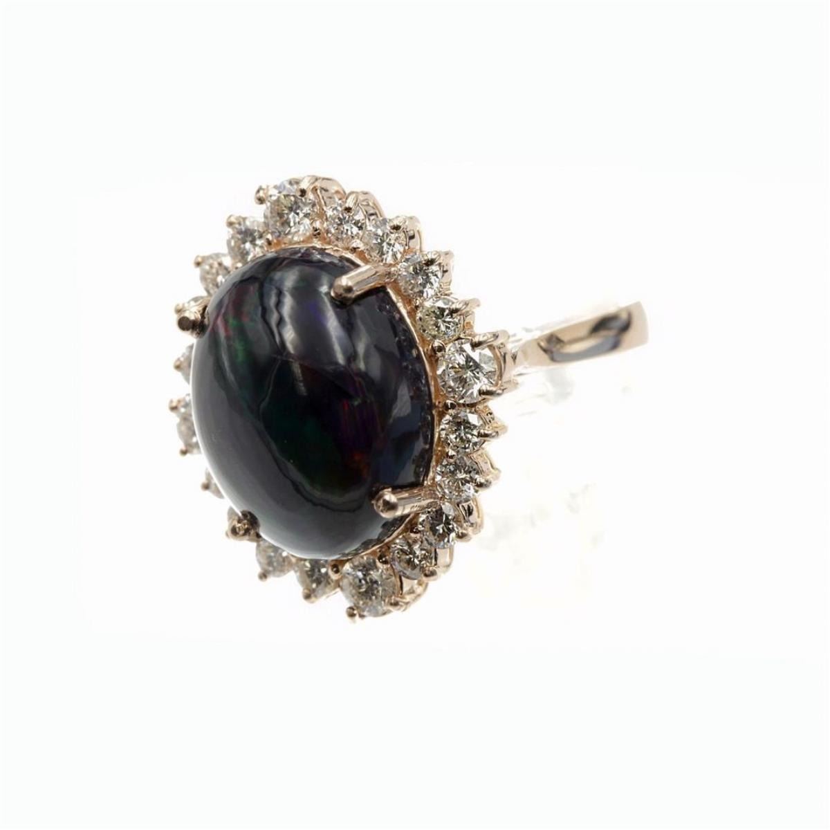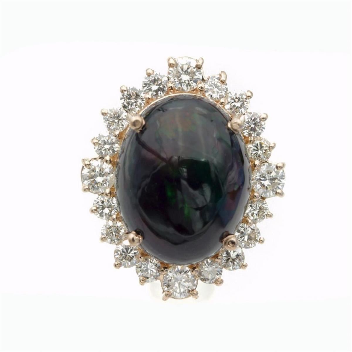 One Natural Diamond and Opal Anniversary Ring in 14k Gold. Size 6.75 but can be resized. Ring design is fancy cocktail with a split shank. Four-prong setting with a total gram weight of 8.20g and total carat weight of 7.46 Ct. Ring includes a total of 20 diamonds. Main stone is natural and non-enhanced. Main stone shape is opal, 6.09 ct,, fine dark clarity, and green opal color. Height of opal is 15.80 mm and width is 12.60 mm, with excellent cut. Side stone is natural and not enhanced, totaling 1.37 Ct. Diamond color is G, clarity VS2-SI1, shape is round cut, and cut is excellent. Retail value of $9,975.