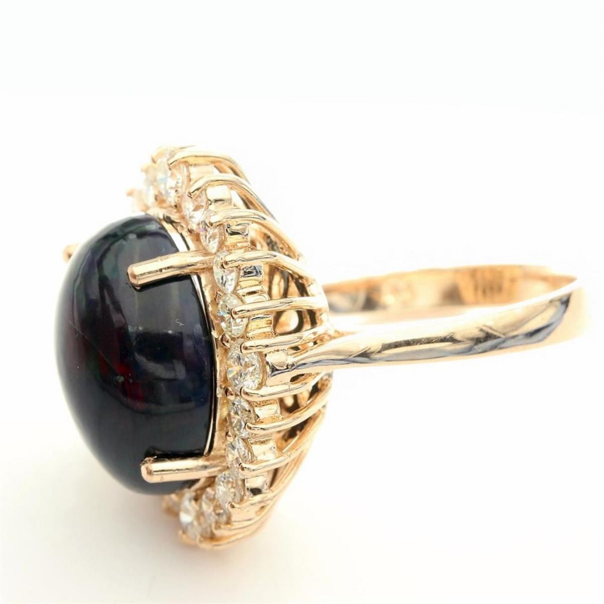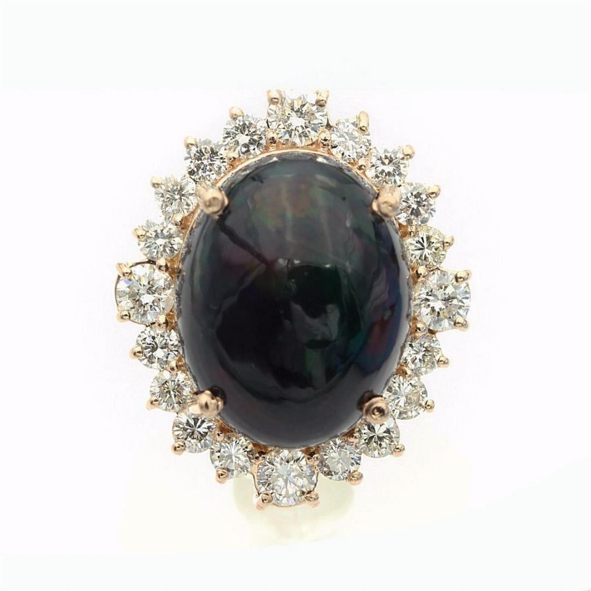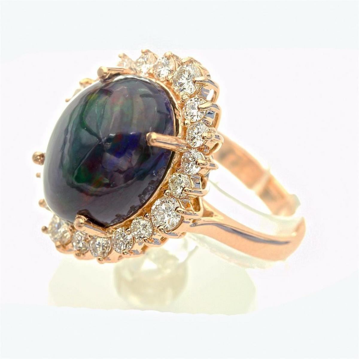 One Natural Diamond and Opal Anniversary Ring in 14k Gold. Size 6.75 but can be resized. Ring design is fancy cocktail with a split shank. Four-prong setting with a total gram weight of 8.20g and total carat weight of 7.46 Ct. Ring includes a total of 20 diamonds. Main stone is natural and non-enhanced. Main stone shape is opal, 6.09 ct,, fine dark clarity, and green opal color. Height of opal is 15.80 mm and width is 12.60 mm, with excellent cut. Side stone is natural and not enhanced, totaling 1.37 Ct. Diamond color is G, clarity VS2-SI1, shape is round cut, and cut is excellent. Retail value of $9,975.