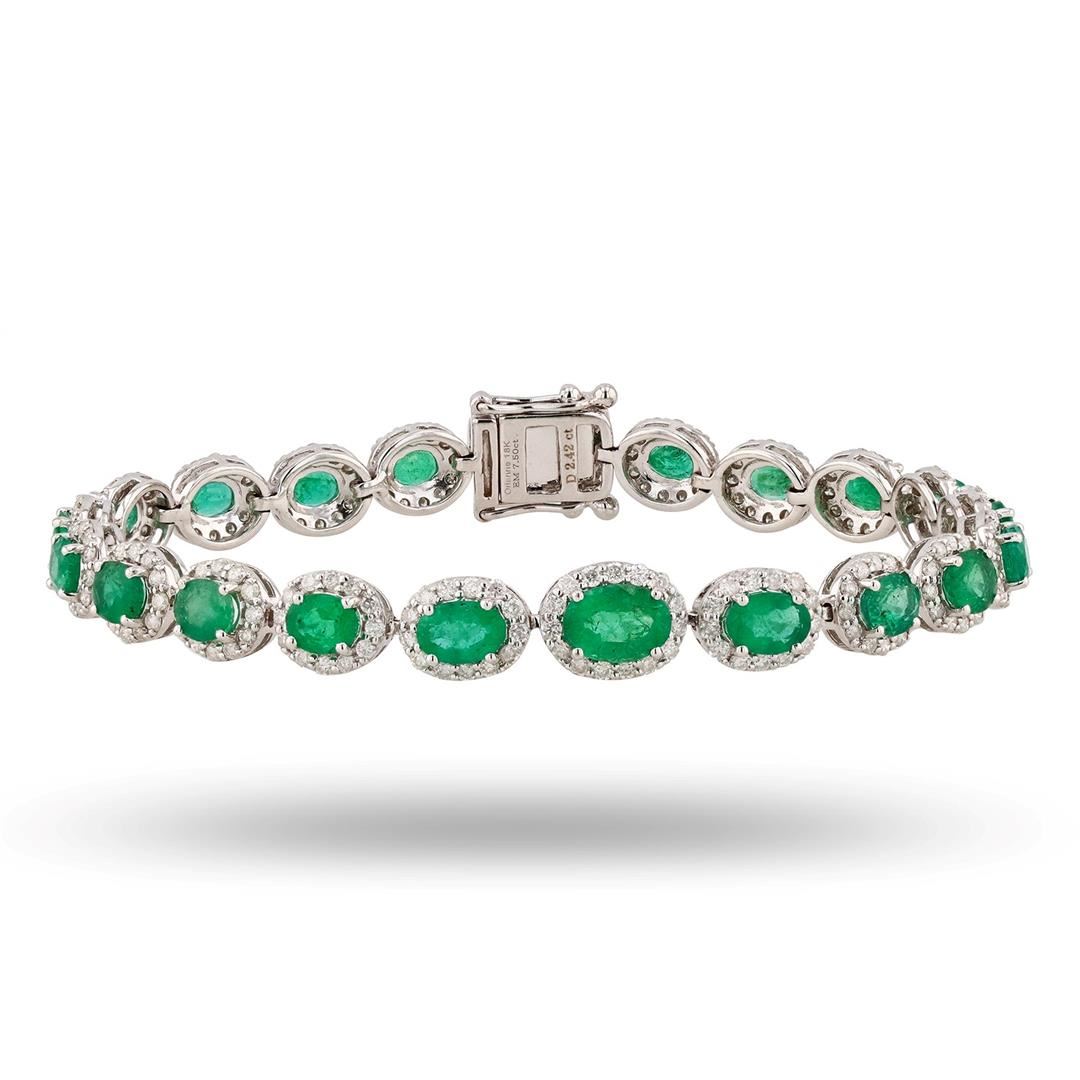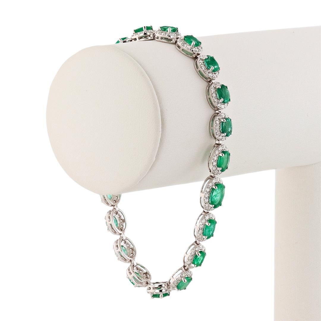 18K Gold Emerald and Diamond Bracelet One polished, stamped, and tested 18K white gold bracelet mounted with: 21 genuine faceted emeralds weighing approximately 7.50 carats, and 257 genuine round diamonds weighing approximately 2.42 carats. The bracelet measures 7 inches in length and is finished with a tension lock clasp and safety clasp. This item weighs 15.7 grams, condition is new, excellent workmanship. MAIN GEMSTONES Species: Natural Beryl Variety: Emerald Shape: Oval Cutting Style: Brilliant Cut Crown Step Cut Pavilion Quantity: 21 Emeralds Measurements: 5 x 4 - 7 x 5 mm Total Weight: 7.50 carats Color: Green Cut Grade: Good - Very Good Refractive Index: 1.564 - 1.595 DR Birefringence: 0.005 to 0.009 Hardness: 7.5 - 8 ADJACENT GEMSTONES ON BRACELET Identity: Natural Diamond Shape: Round Cutting Style: Brilliant Cut Quantity: 257 Diamonds Measurements: 1.2 - 1.4 mm Total Weight: 2.42 carats Clarity Grade: SI-2 to I-2 Color Grade: G-I Refractive Index: 2.418 Hardness: 10 TOTAL EMERALD WEIGHT: 7.50 cts TOTAL DIAMOND WEIGHT: 2.42 cts WEIGHT OF ITEM: 15.7 grams GOLD CONTENT: 18K White Gold