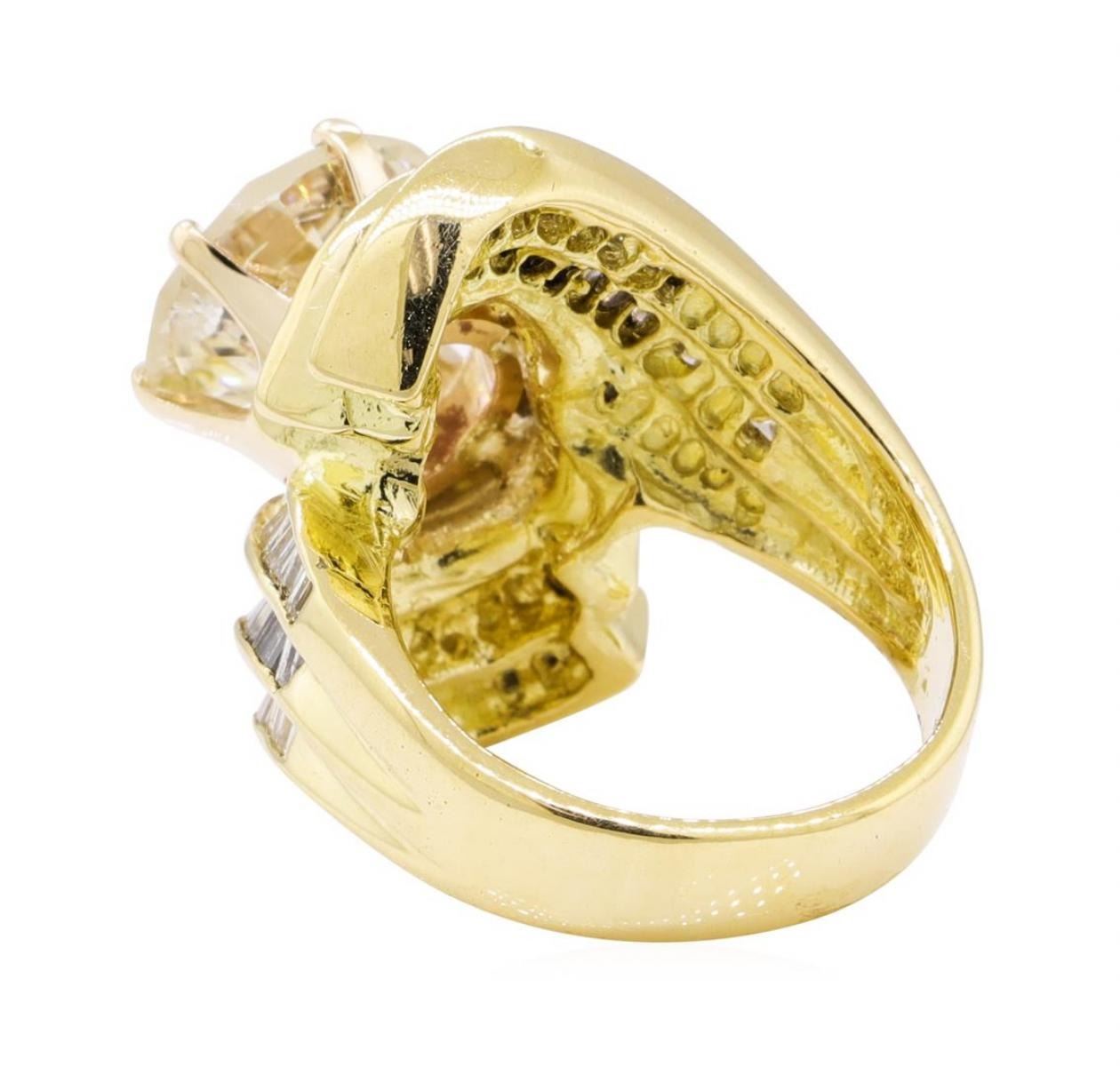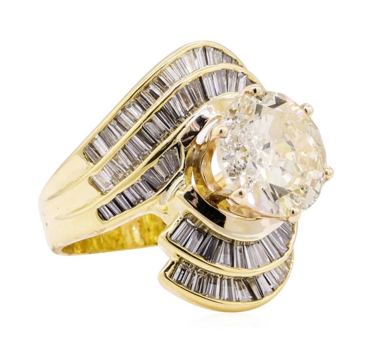 One electronically tested 18KT yellow gold lady's combination cast & assembled fashion ring with a bypass swirl with a bright polish finish. The featured lady's ring has a shank measuring 4.00 millimeters wide. Identified with markings of '18K'. Condition is like new, good workmanship. Containing: One prong set round brilliant cut diamond, measuring 11.11 - 11.05 x 6.37mm (depth est.) , 5.00.%. GTCF approximate weight of 5.01ct. Graded in the setting. Color L - M Clarity I-1 Cut Good Ninety channel set baguette cut (tapered) diamonds, measuring from 1.80 x 1.00 x 0.85mm (depth est.) to 2.70 x 1.50 x 1.28mm (depth est.) approximate total weight of 90 Stones = 2.50 ct. Graded in the setting. Color J - L Clarity VS-2 to SI-1 Cut Very Good. Total Weight of Diamonds 7.51ct.. Total Weight of Ring 15.80gm GAS Appraised at $40990.00. GAS Appraised.