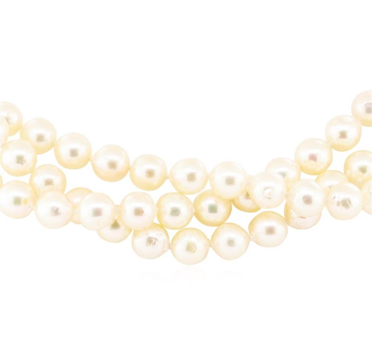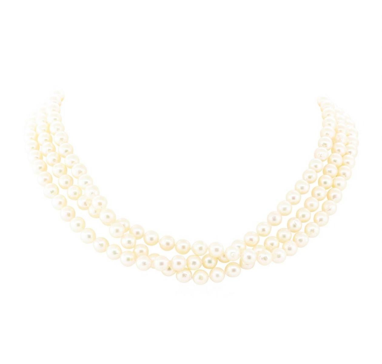 One akoya cultured pearl strand measuring approximately sixty inches in length featuring pearls measuring approximately 7.5mm and a total weight of 117.3 grams.