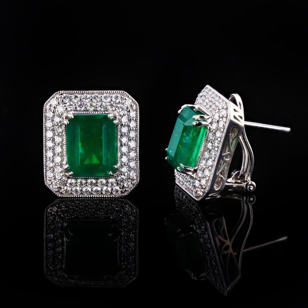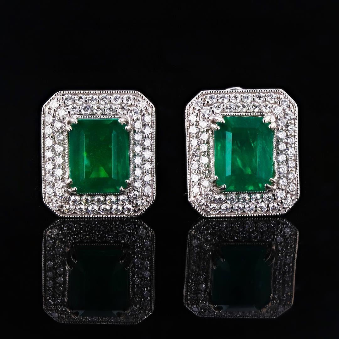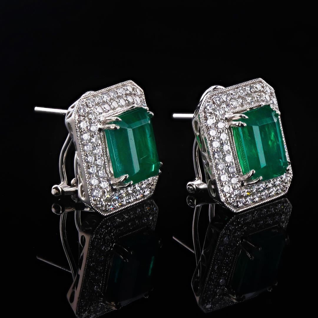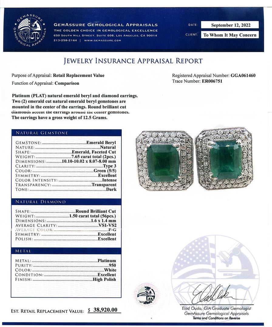 7.65ctw Emerald and 1.50ctw Diamond Platinum Earrings. Platinum (PLAT) natural emerald beryl and diamond earrings. Two (2) emerald cut natural emerald beryl gemstones are mounted in the center of the earrings. Round brilliant cut diamonds accent the earrings around the center gemstones. The earrings have a gross weight of 12.5 Grams. NATURAL GEMSTONE GEMSTONE: Emerald Beryl NATURE: Natural SHAPE: Emerald, Faceted Cut WEIGHT: 7.65 carat total (2pcs.) DIMENSIONS: 10.10-10.02 x 8.07-8.00mm CLARITY: Type 3 COLOR: Green (5/5) SYMMETRY: Excellent COLOR INTENSITY: Intense TRANSPARENCY: Transparent TONE: Dark NATURAL DIAMOND SHAPE: Round Brilliant Cut WEIGHT: 1.50 carat total (56pcs.) DIMENSIONS: 1.6 x 1.4mm AVERAGE CLARITY: VS1-VS2 AVERAGE COLOR: F-G SYMMETRY: Excellent POLISH: Excellent METAL METAL: Platinum PURITY: 950 COLOR: White CONDITION: Excellent FINISH: High Polish