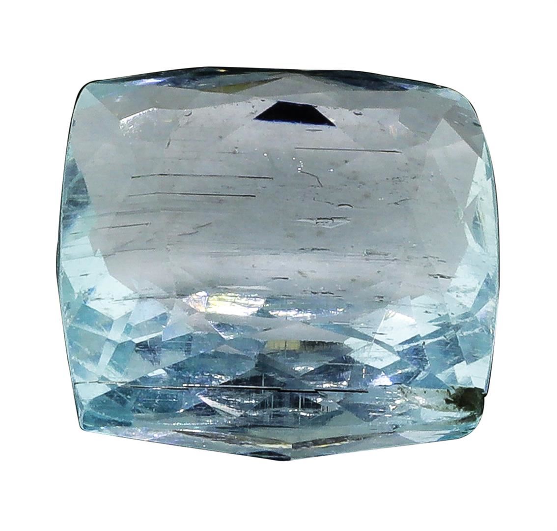One natural cushion cut aquamarine with an exact weight of 7.68ct., clarity is slightly included, slightly grayish greenish blue, medium light. Gemological Appraisals Services estimates the retail value at $2956.8 GAS Appraised.