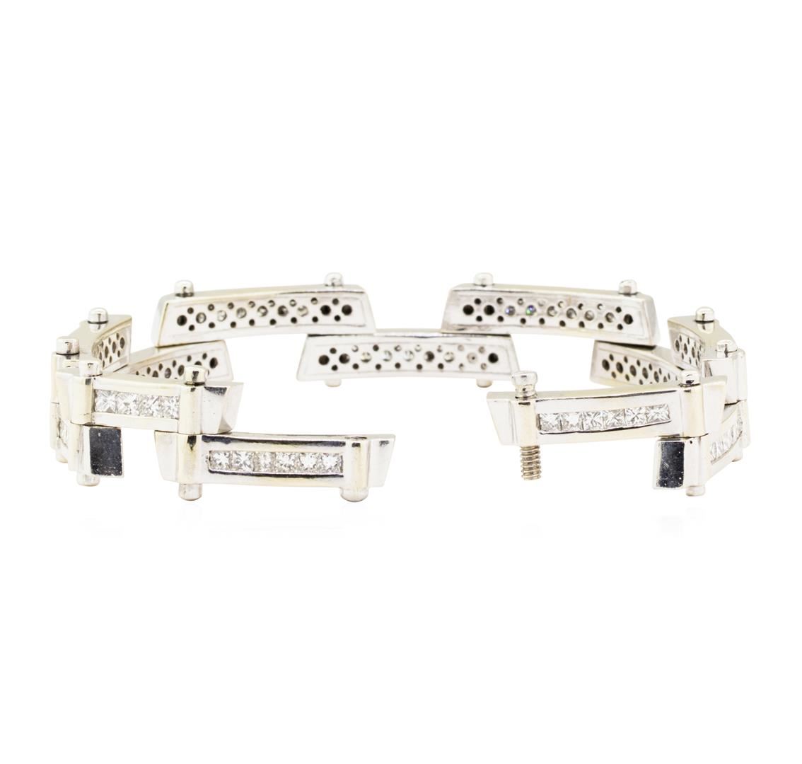 One electronically tested 18KT white gold man's combination cast & assembled fashion staggered bar bracelet with a screw clasp with a bright polish finish. The featured man's bracelet measures approximately nine inches in length. Condition is like new, good workmanship. Containing: Eight channel set princess cut diamonds, measuring 2.80 x 2.70 x 2.03mm (depth est.) approximate total weight of 8 Stones = 1.00ct. Graded in the setting. Color H - I Clarity VS-2 to SI-1 Cut Very Good Sixty channel set princess cut diamonds, measuring 2.70 x 2.60 x 1.95mm (depth est.) approximate total weight of 60 Stones = 6.75ct. Graded in the setting. Color H - I Clarity VS-2 to SI-1 Cut Very Good. Total Weight of Diamonds 7.75ct.. Total Weight of Staggered Bar Bracelet 83.80gm GAS Appraised at $33725.00. GAS Appraised.