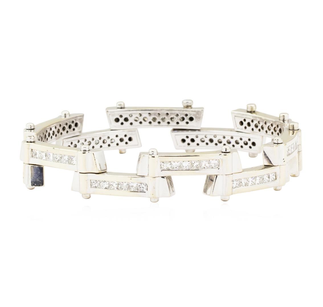 One electronically tested 18KT white gold man's combination cast & assembled fashion staggered bar bracelet with a screw clasp with a bright polish finish. The featured man's bracelet measures approximately nine inches in length. Condition is like new, good workmanship. Containing: Eight channel set princess cut diamonds, measuring 2.80 x 2.70 x 2.03mm (depth est.) approximate total weight of 8 Stones = 1.00ct. Graded in the setting. Color H - I Clarity VS-2 to SI-1 Cut Very Good Sixty channel set princess cut diamonds, measuring 2.70 x 2.60 x 1.95mm (depth est.) approximate total weight of 60 Stones = 6.75ct. Graded in the setting. Color H - I Clarity VS-2 to SI-1 Cut Very Good. Total Weight of Diamonds 7.75ct.. Total Weight of Staggered Bar Bracelet 83.80gm GAS Appraised at $33725.00. GAS Appraised.