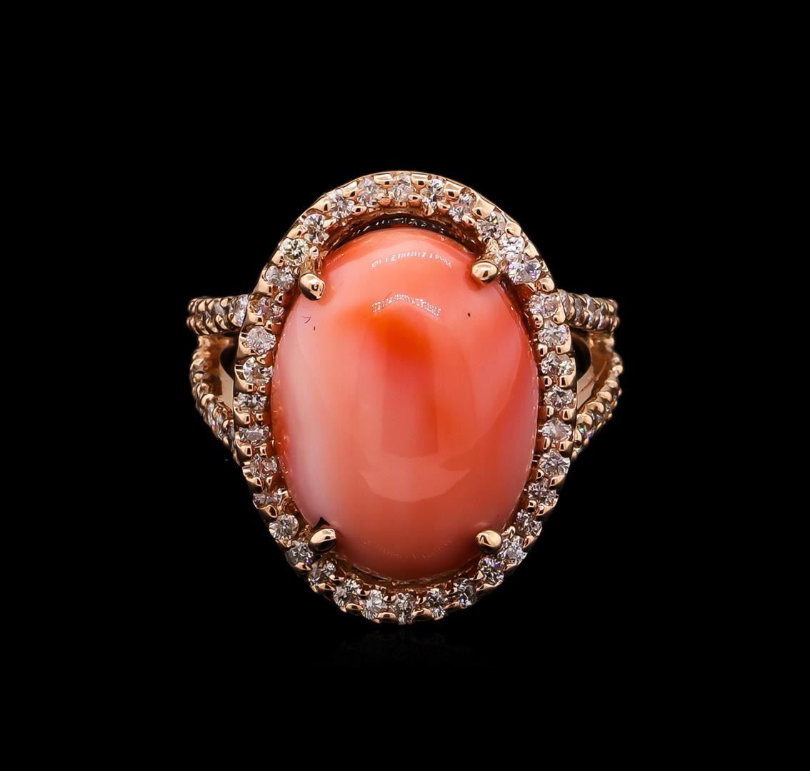 One ring featuring: 14KT rose gold weighing 7.13 grams containing one coral with a total weight of 7.78ct and diamonds with a total weight of 0.75ct.