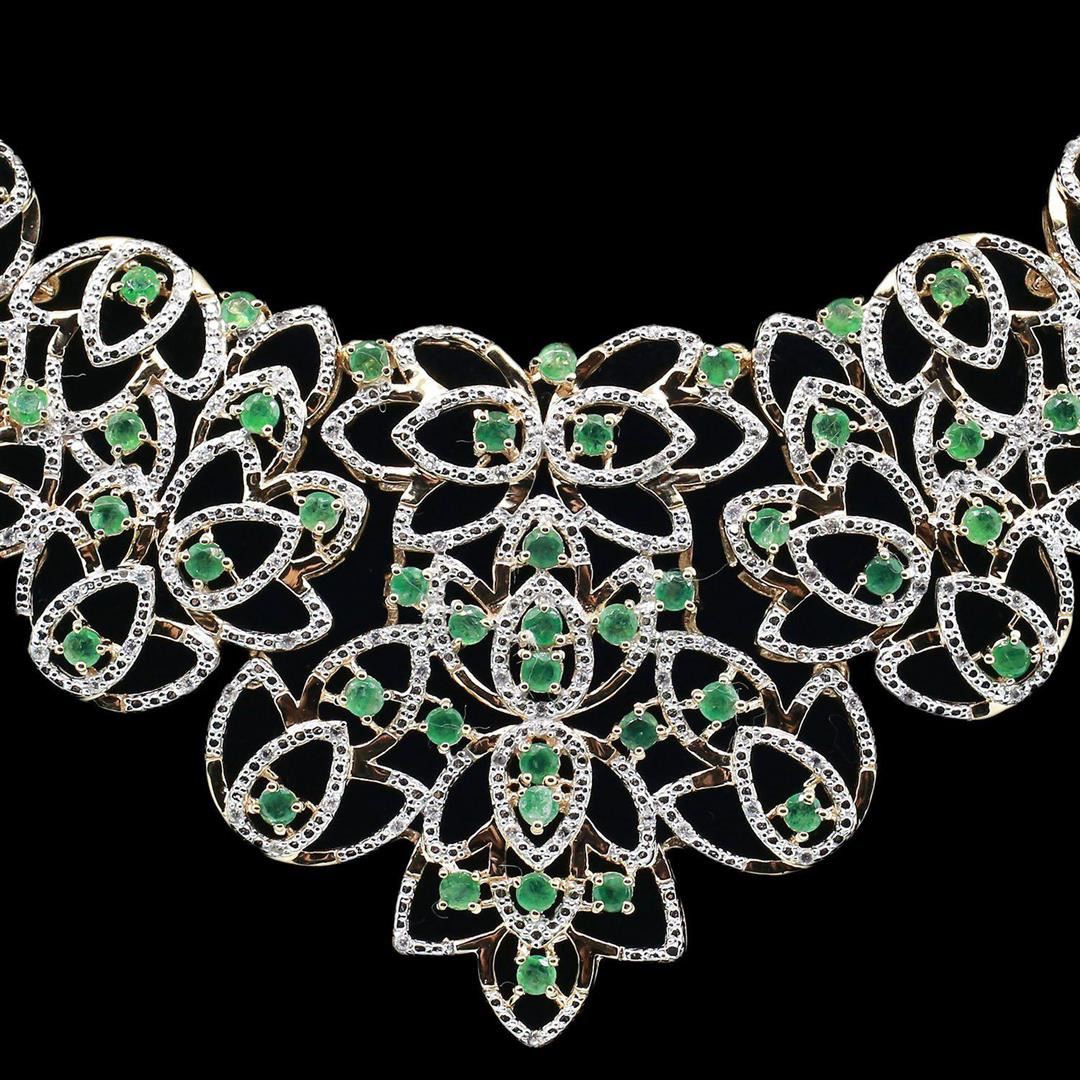 One electronically tested 925 silver ladies cast and assembled emerald and white topaz necklace. Seventeen inch length necklace features a rigid cascading emerald and white topaz floral design supported by a flexible emerald and white topaz link ribbon, t