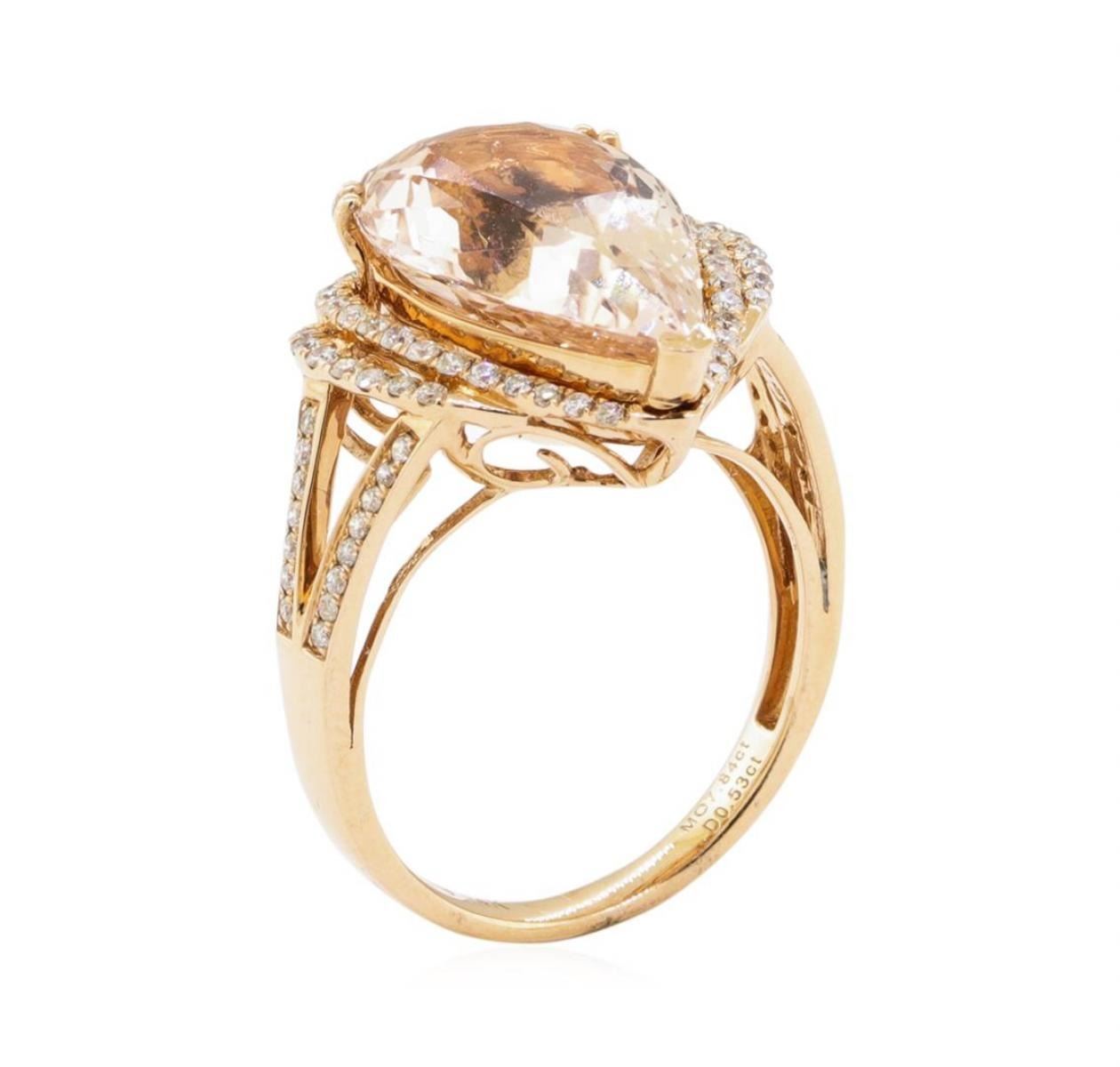 One electronically tested 14KT rose gold ladies cast morganite and diamond ring with a bright polish finish. The featured morganite is set within an inner rose gold basket and stylized diamond bezel supported by diamond set split shoulders, completed by a two millimeter wide band. Trademark is Orianne. Identified with markings of "14K". Condition is new, good workmanship. Containing: One prong set pear mixed cut natural morganite, measuring 19.00 x 11.20 x 6.50mm, 5% bulge factor, approximate weight of 7.84ct., clarity is eye clean, type I, light, slightly brownish, red orange color, (GIA RO 3/2), cut is good. Transmitting light with no distortion, transparent. Graded in the setting. Seventy-Seven prong set round brilliant cut diamonds approximate total weight of 77 Stones = 0.53ct. Clarity grade is an average for the group. Graded in the setting. Clarity I-1 to I-2 Color F - H Total Weight of Colored Stones 7.84 ct. Total Weight of Diamonds 0.53 ct. Total Weight of Ring 7.85 gm Estimated Retail Value $ 7,720.00 US