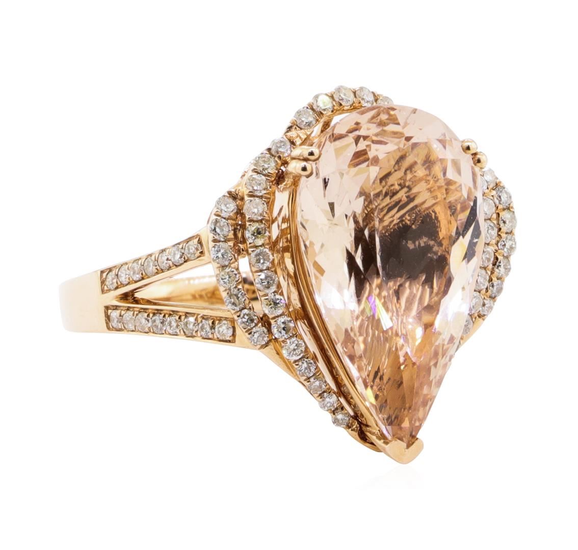 One electronically tested 14KT rose gold ladies cast morganite and diamond ring with a bright polish finish. The featured morganite is set within an inner rose gold basket and stylized diamond bezel supported by diamond set split shoulders, completed by a two millimeter wide band. Trademark is Orianne. Identified with markings of "14K". Condition is new, good workmanship. Containing: One prong set pear mixed cut natural morganite, measuring 19.00 x 11.20 x 6.50mm, 5% bulge factor, approximate weight of 7.84ct., clarity is eye clean, type I, light, slightly brownish, red orange color, (GIA RO 3/2), cut is good. Transmitting light with no distortion, transparent. Graded in the setting. Seventy-Seven prong set round brilliant cut diamonds approximate total weight of 77 Stones = 0.53ct. Clarity grade is an average for the group. Graded in the setting. Clarity I-1 to I-2 Color F - H Total Weight of Colored Stones 7.84 ct. Total Weight of Diamonds 0.53 ct. Total Weight of Ring 7.85 gm Estimated Retail Value $ 7,720.00 US