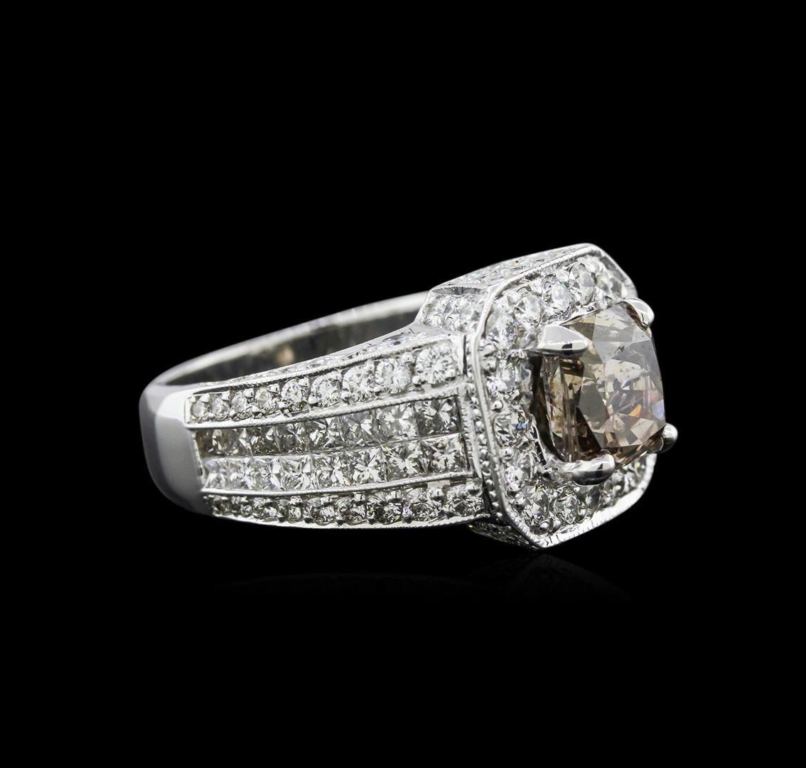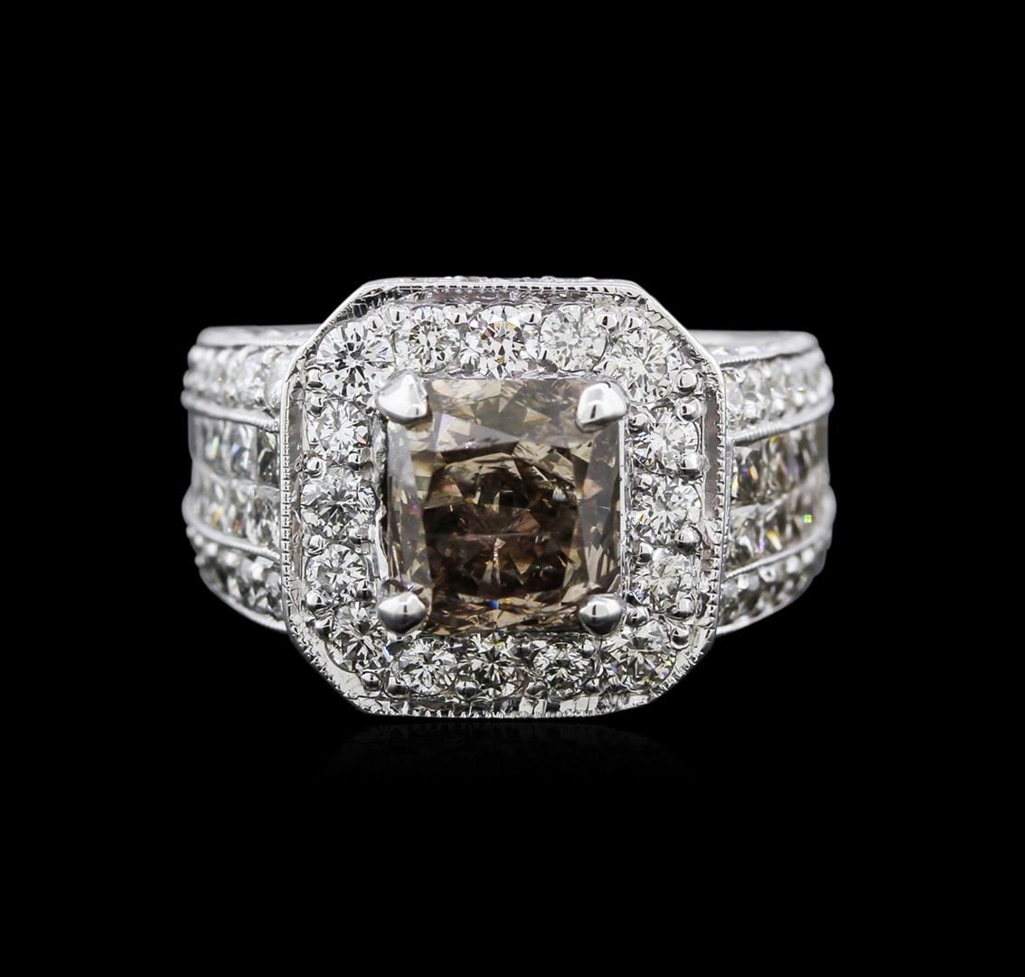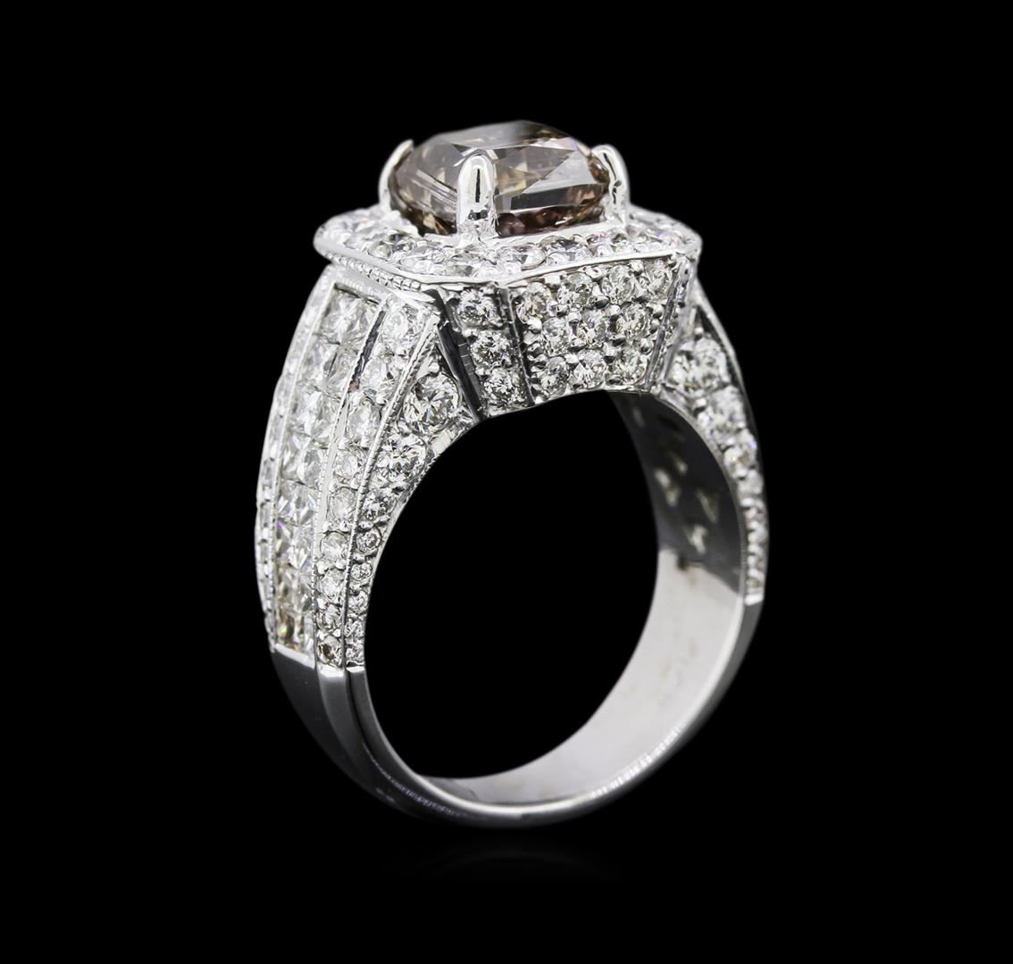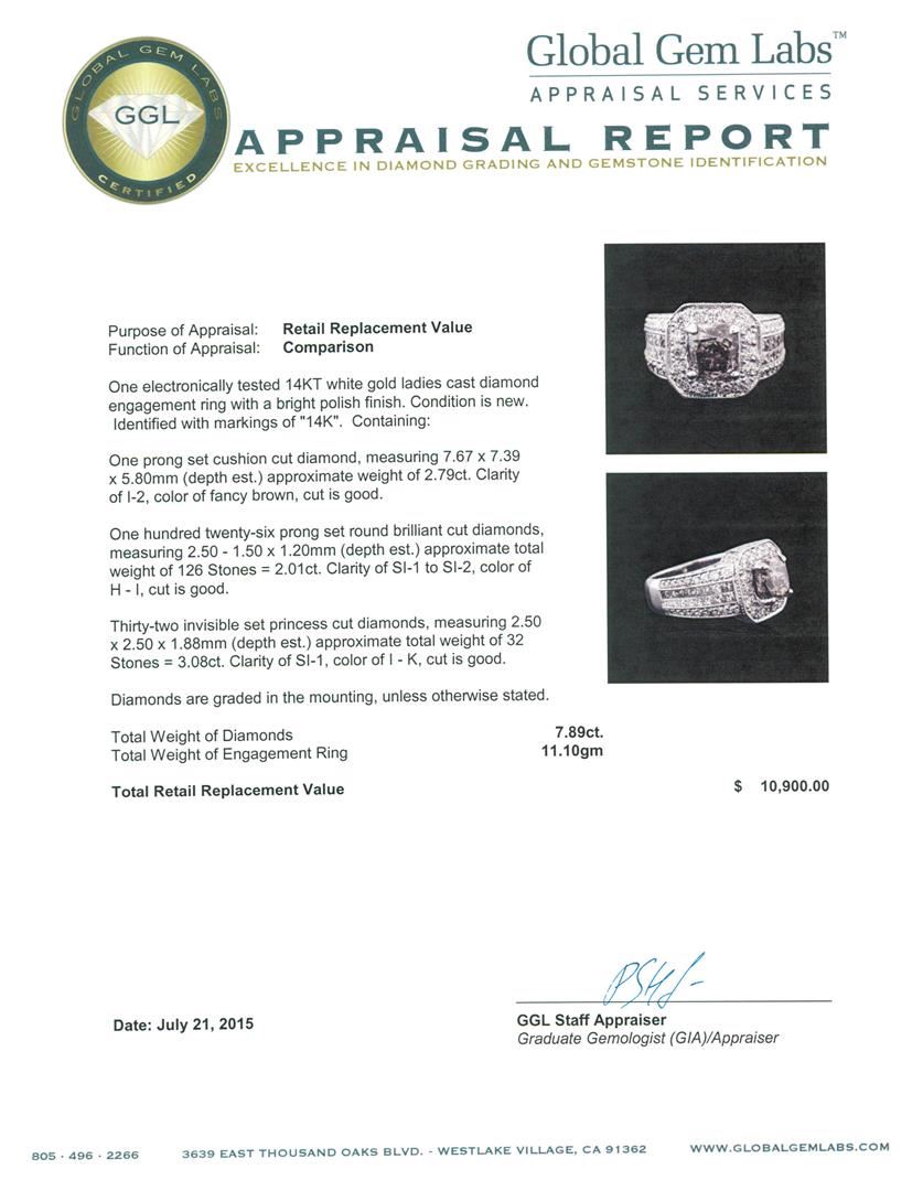 One electronically tested 14KT white gold ladies cast diamond engagement ring with a bright polish finish. Identified with markings of "14K". Condition is new. Containing: One prong set cushion cut diamond, measuring 7.67 x 7.39 x 5.80mm (depth est.) approximate weight of 2.79ct. Clarity: I-2, color of fancy brown, cut is Good. One Hundred Twenty-Six prong set round brilliant cut diamonds, measuring 2.50 - 1.50 x 1.20mm (depth est.) approximate total weight of 126 Stones = 2.01ct. Clarity: SI-1 to SI-2. Color: H - I, Cut is Good. Thirty-Two invisible set princess cut diamonds, measuring 2.50 x 2.50 x 1.88mm (depth est.) approximate total weight of 32 Stones = 3.08ct. Clarity: SI-1. Color: I - K, Cut is Good. Diamonds are graded in the mounting, unless otherwise stated. Total Weight of Diamonds 7.89ct. Total Weight of Engagement Ring 11.10gm. GGL Appraised.