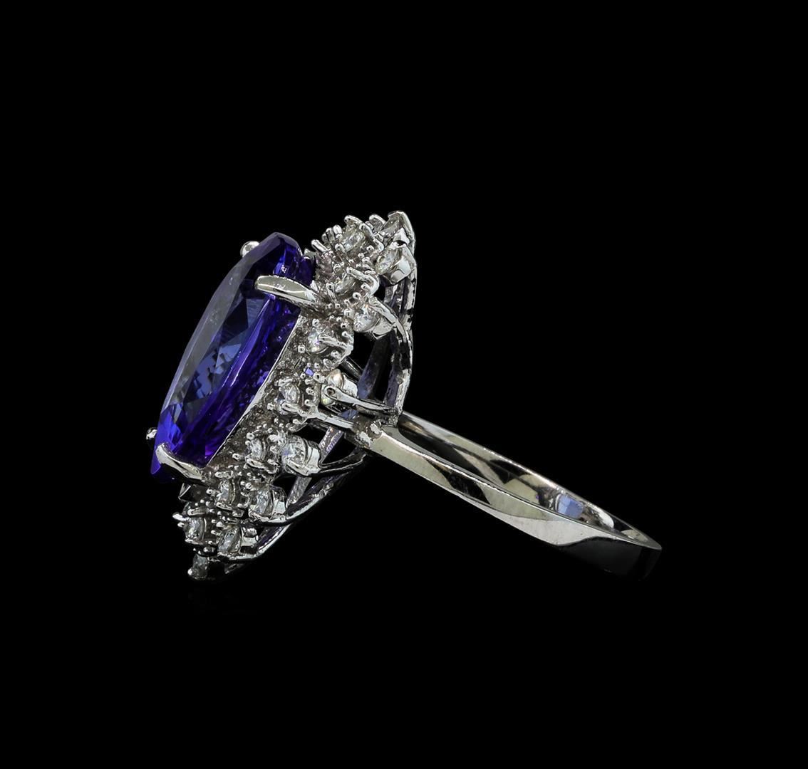 One electronically tested 14KT white gold lady's cast fashion ring with a double basket halo with a bright polish with milgrain detailing finish. The featured lady's ring has a shank measuring 2.12 millimeters wide. Identified with markings of 'K14'. Condition is new, good workmanship. Containing: One prong set pear modified brilliant cut natural tanzanite, measuring 15.01 x 12.17 x 6.76mm, (depth est.) approximate weight of 7.95ct., clarity is eye clean, medium light, moderately strong, violetish blue color, (GIA vB 4/4), cut is very good. Transmitting light with no distortion, transparent. Colored gemstones are presumed to have been subjected to commonly used enhancement processes. Graded in the setting. Fourteen prong set round brilliant cut diamonds, measuring 2.10 - 2.00 x 1.27mm (depth est.) approximate total weight of 14 Stones = 0.46ct. Graded in the setting. Clarity SI-1 to I-1. Color: H - I Cut Good Fourteen prong set round brilliant cut diamonds, measuring 1.80 - 1.70 x 1.07mm (depth est.) approximate total weight of 14 Stones = 0.28ct. Graded in the setting. Clarity SI-1 to I-1. Color: H - I Cut Good. Total Weight of Colored Stones 7.95ct.. Total Weight of Diamonds 0.74ct.. Total Weight of Ring 6.10gm GAS Appraised.