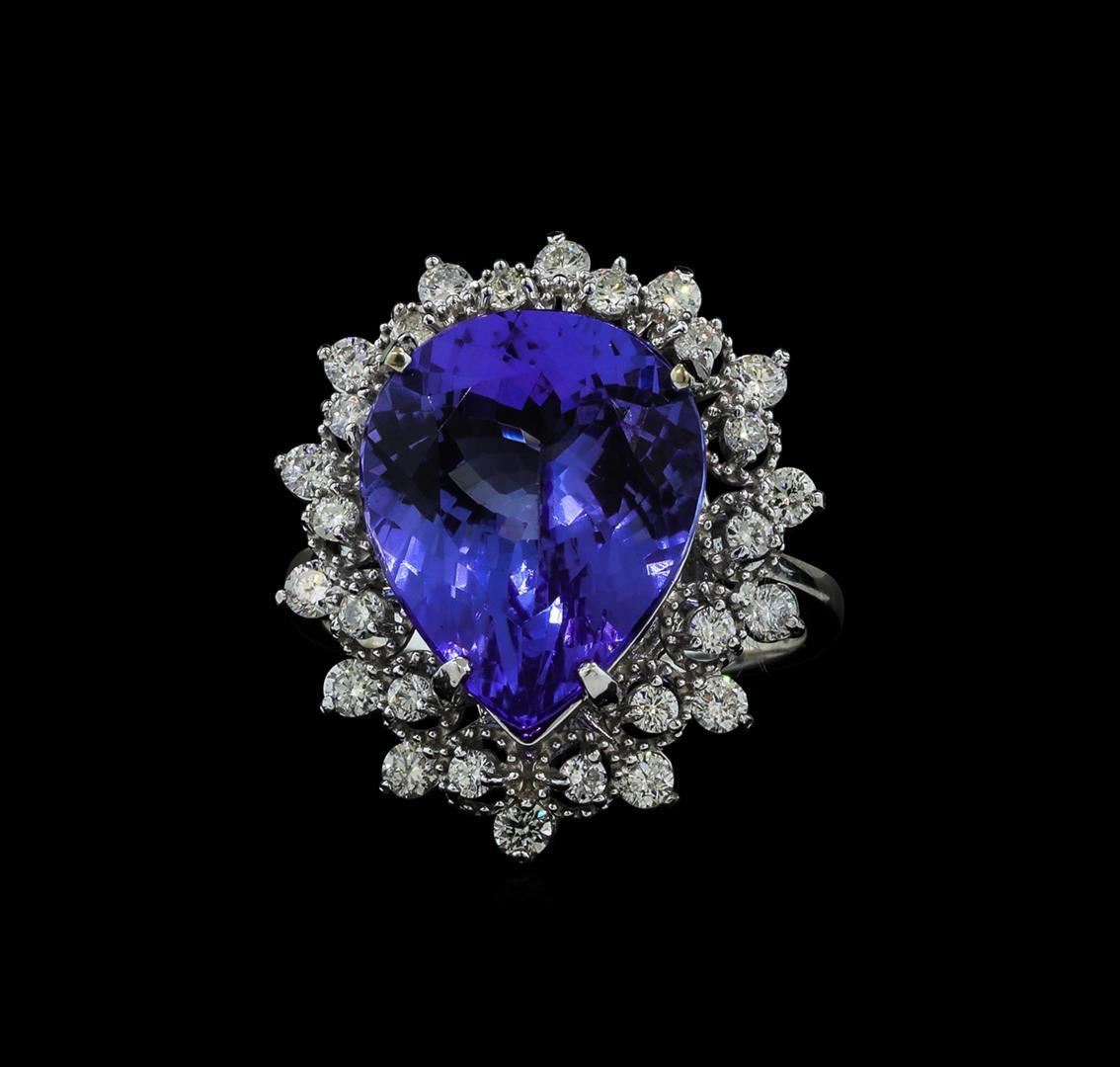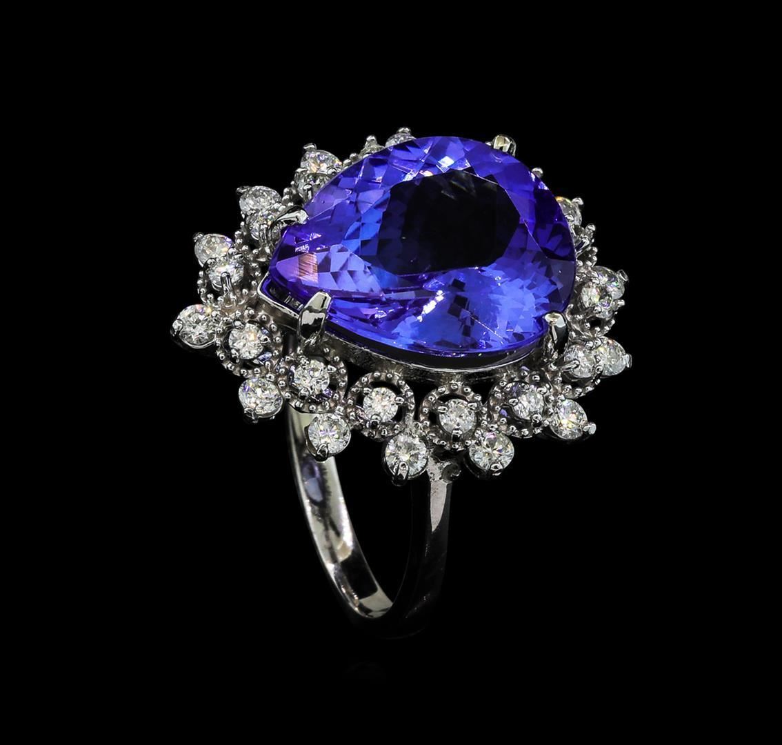 One electronically tested 14KT white gold lady's cast fashion ring with a double basket halo with a bright polish with milgrain detailing finish. The featured lady's ring has a shank measuring 2.12 millimeters wide. Identified with markings of 'K14'. Condition is new, good workmanship. Containing: One prong set pear modified brilliant cut natural tanzanite, measuring 15.01 x 12.17 x 6.76mm, (depth est.) approximate weight of 7.95ct., clarity is eye clean, medium light, moderately strong, violetish blue color, (GIA vB 4/4), cut is very good. Transmitting light with no distortion, transparent. Colored gemstones are presumed to have been subjected to commonly used enhancement processes. Graded in the setting. Fourteen prong set round brilliant cut diamonds, measuring 2.10 - 2.00 x 1.27mm (depth est.) approximate total weight of 14 Stones = 0.46ct. Graded in the setting. Clarity SI-1 to I-1. Color: H - I Cut Good Fourteen prong set round brilliant cut diamonds, measuring 1.80 - 1.70 x 1.07mm (depth est.) approximate total weight of 14 Stones = 0.28ct. Graded in the setting. Clarity SI-1 to I-1. Color: H - I Cut Good. Total Weight of Colored Stones 7.95ct.. Total Weight of Diamonds 0.74ct.. Total Weight of Ring 6.10gm GAS Appraised.
