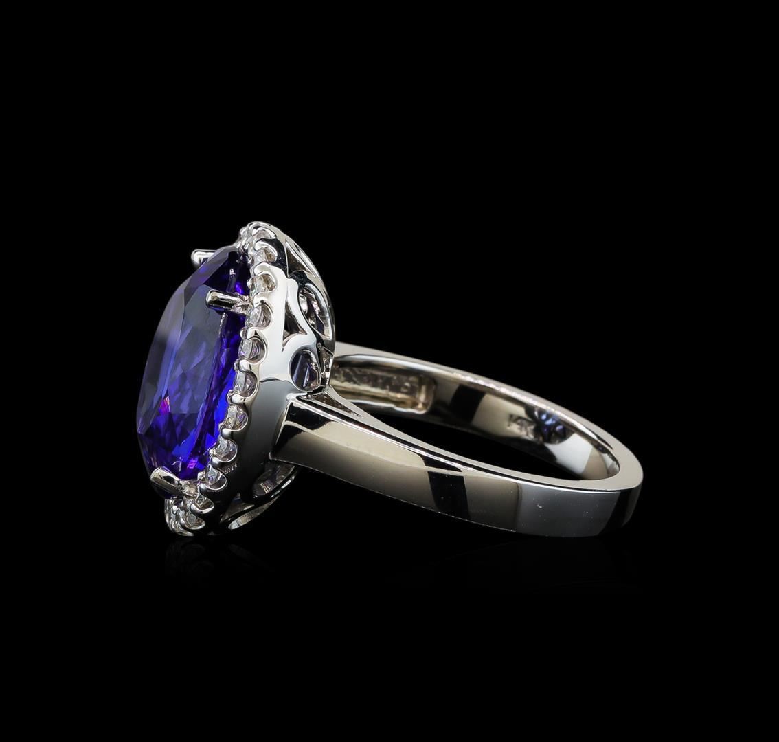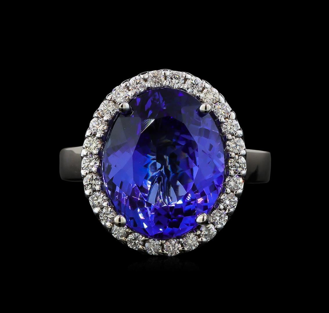 One electronically tested 14KT white gold lady's cast fashion ring with a basket halo with a bright polish finish. The featured lady's ring has a shank measuring 2.91 millimeters wide. Identified with markings of '14K'. Condition is new, good workmanship. Containing: One prong set oval modified brilliant cut natural tanzanite, measuring 14.37 x 11.56 x 7.02mm, (depth est.) approximate weight of 7.98ct., clarity is eye clean, medium dark, moderately strong, violetish blue color, (GIA vB 6/4), cut is very good. Transmitting light with no distortion, transparent. Colored gemstones are presumed to have been subjected to commonly used enhancement processes. Graded loose prior to setting in the GIA Laboratory, Report #5172668395. Twenty-Six prong set round brilliant cut diamonds, measuring 1.70 - 1.60 x 1.02mm (depth est.) approximate total weight of 26 Stones = 0.45ct. Graded in the setting. Clarity SI-1 to I-1. Color: H - I Cut Good. Total Weight of Colored Stones 7.98ct.. Total Weight of Diamonds 0.45ct.. Total Weight of Ring 8.40gm GAS Appraised.