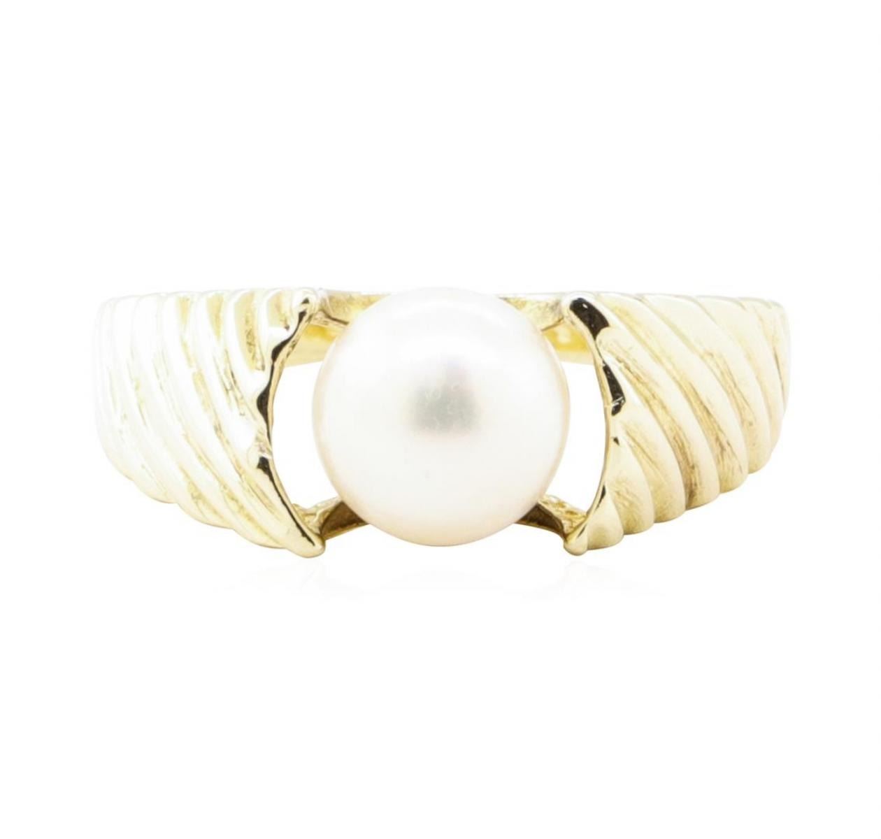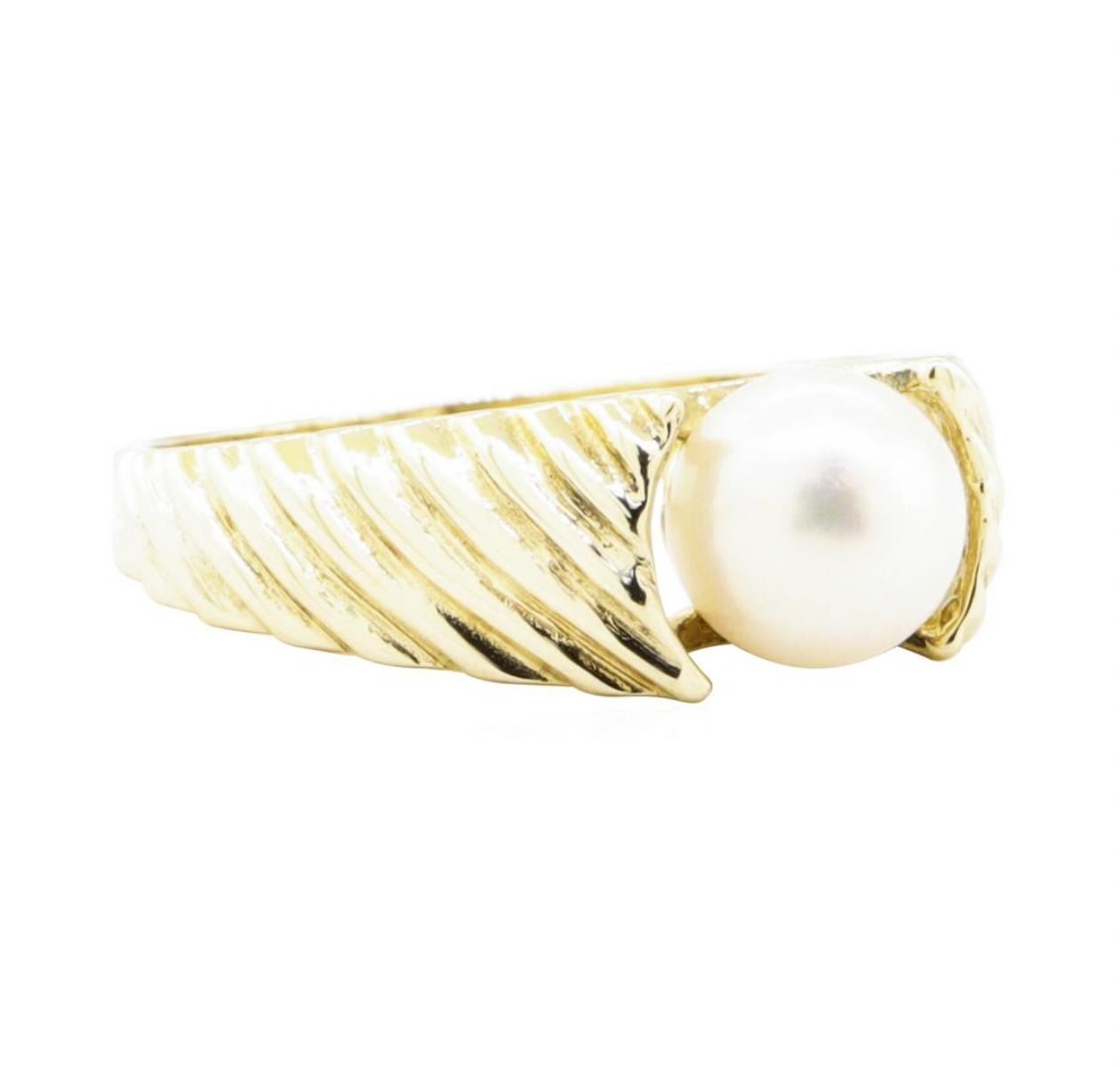 One ring with a hand finished, grooved pattern tapered shank featuring: 14KT yellow gold weighing 2.9 grams containing one pearl measuring 7mm.