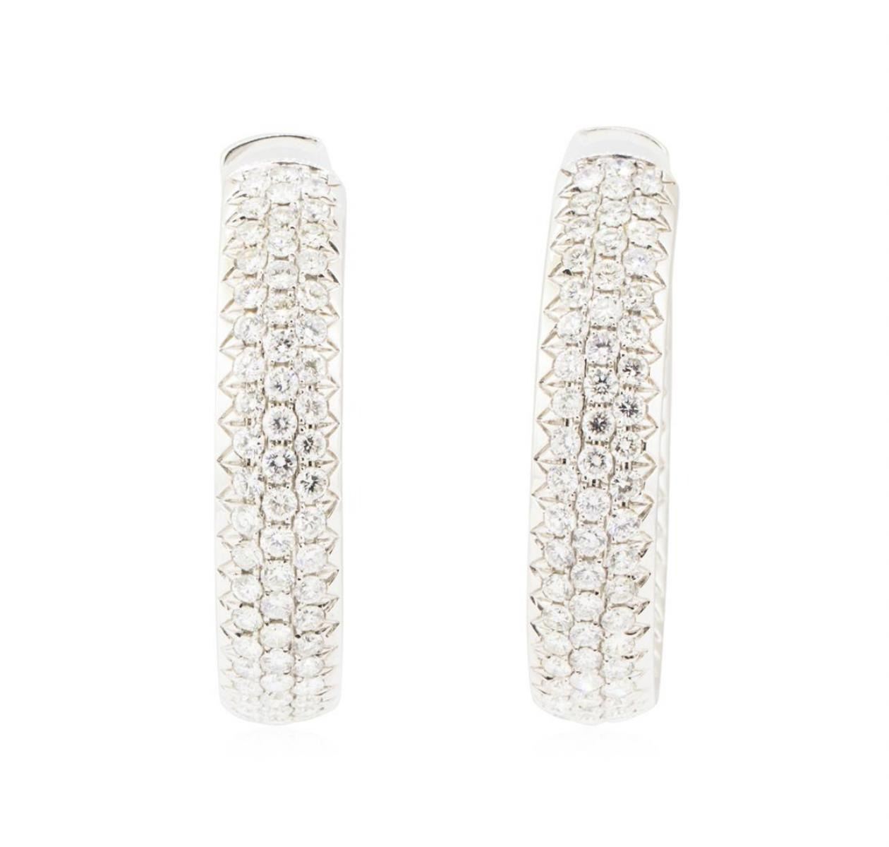 One pair electronically tested 18KT white gold lady's combination cast & assembled fashion hoop earrings with hinged, snap locking posts with a bright polish finish. The featured earrings have a diameter of approximately 39 millimeters. Trademark is AKMS. Identified with markings of '18K'. Condition is new, good workmanship. Containing: Two Hundred Forty-Four prong set round brilliant cut diamonds, measuring 2.20 - 2.00 x 1.30mm (depth est.) approximate total weight of 244 Stones = 8.00ct. Graded in the setting. Color G - H Clarity SI-1 to SI-2 Cut Good. Total Weight of Diamonds 8.00ct.. Total Weight of Earrings 32.40gm GAS Appraised at $18370.00. GAS Appraised.