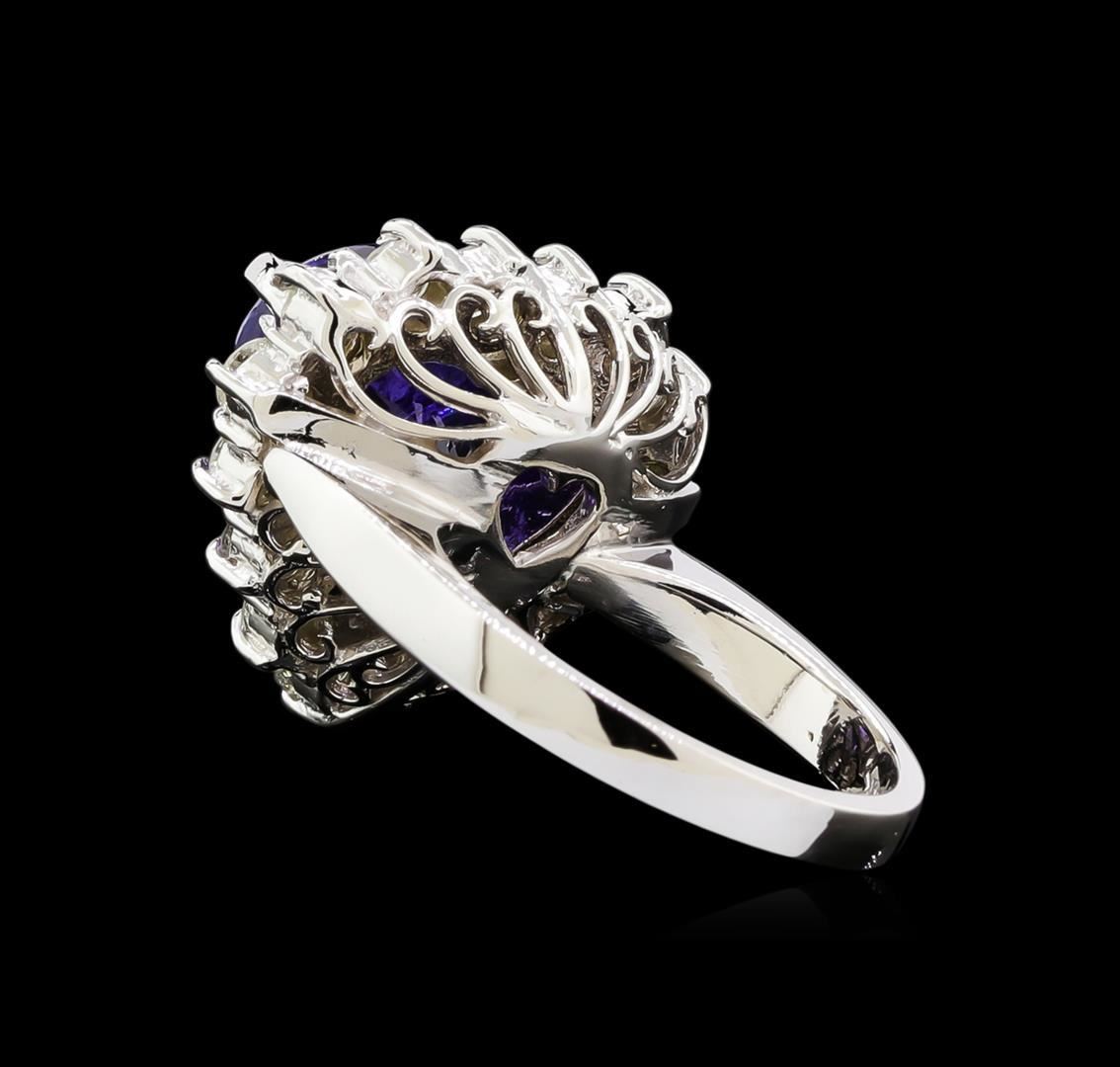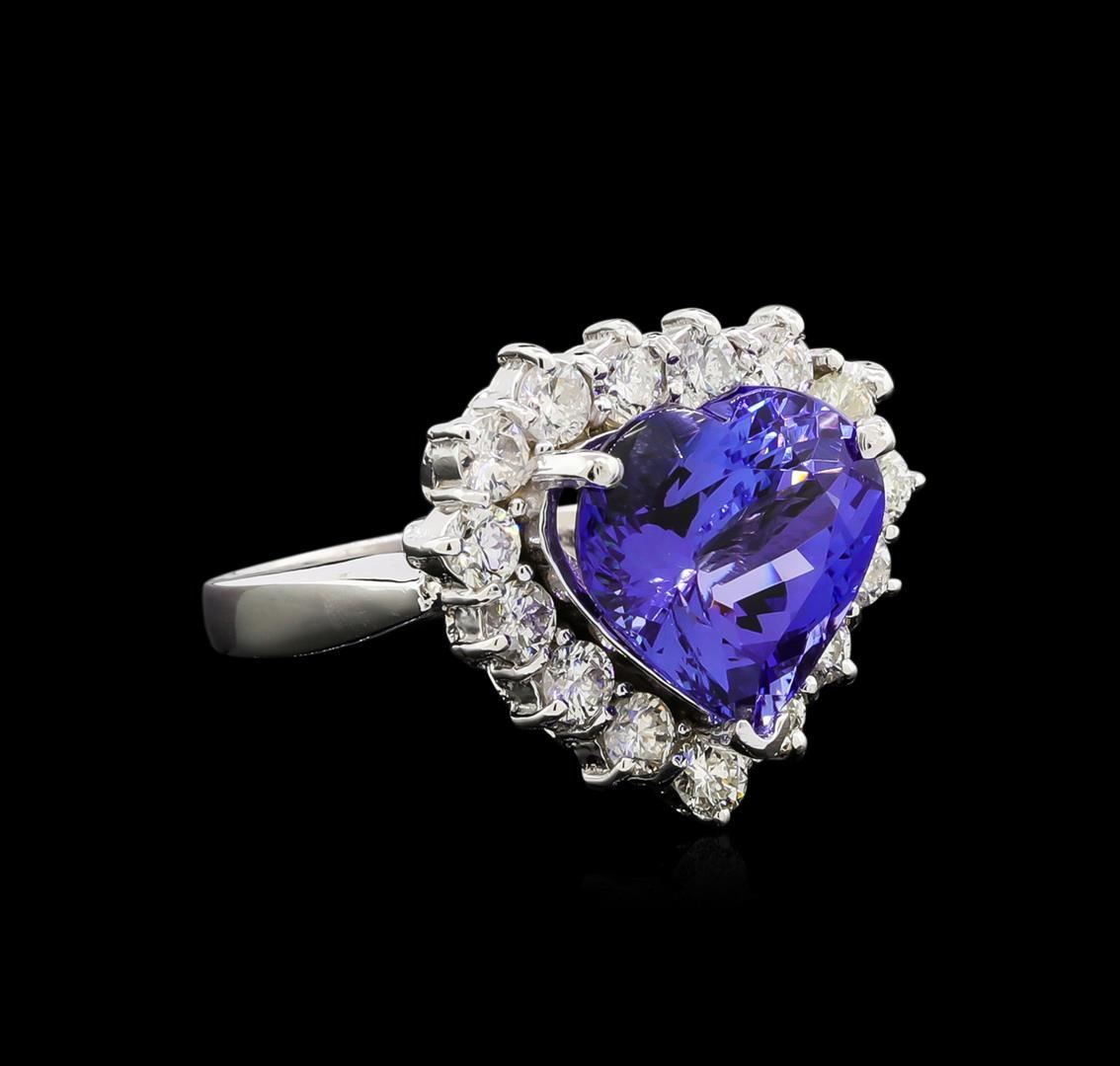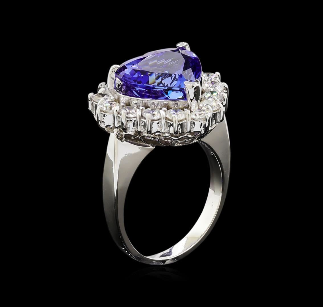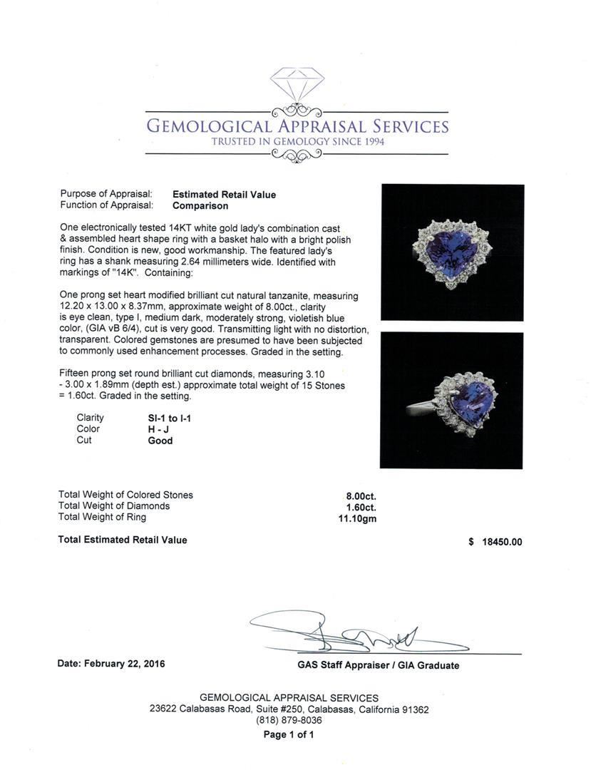 One electronically tested 14KT white gold lady's combination cast & assembled heart shape ring with a basket halo with a bright polish finish. The featured lady's ring has a shank measuring 2.64 millimeters wide. Identified with markings of "14K". Condition is new, good workmanship. Containing: One prong set heart modified brilliant cut natural tanzanite, measuring 12.20 x 13.00 x 8.37mm, approximate weight of 8.00ct., clarity is eye clean, type I, medium dark, moderately strong, violetish blue color, (GIA vB 6/4), cut is very good. Transmitting light with no distortion, transparent. Colored gemstones are presumed to have been subjected to commonly used enhancement processes. Graded in the setting. Fifteen prong set round brilliant cut diamonds, measuring 3.10 - 3.00 x 1.89mm (depth est.) approximate total weight of 15 Stones = 1.60ct. Graded in the setting. Clarity: SI-1 to I-1. Color: H - J. Cut Good. Total Weight of Colored Stones 8.00ct. Total Weight of Diamonds 1.60ct. Total Weight of Ring 11.10gm. GAS Appraised.