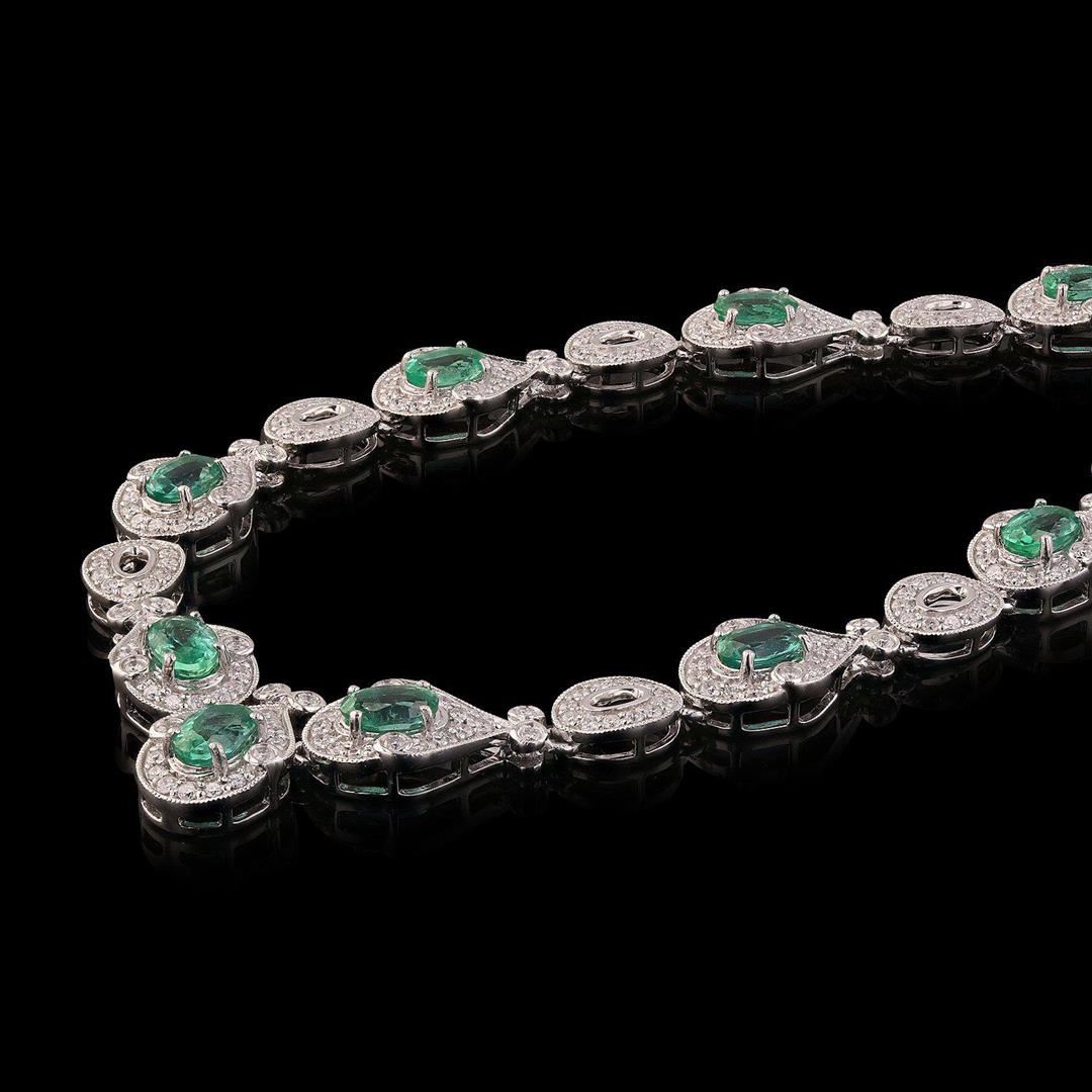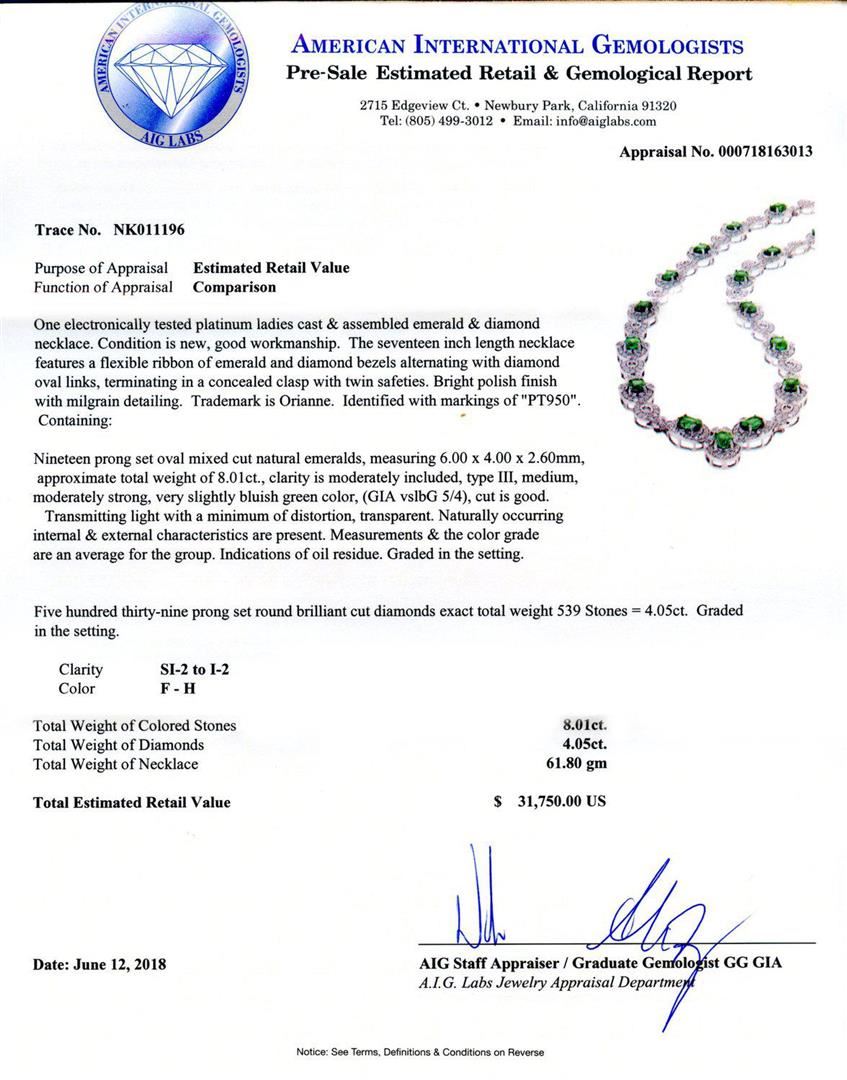 One electronically tested platinum ladies cast & assembled emerald & diamond necklace. Condition is new, good workmanship. The seventeen inch length necklace features a flexible ribbon of emerald and diamond bezels alternating with diamond oval links, ter