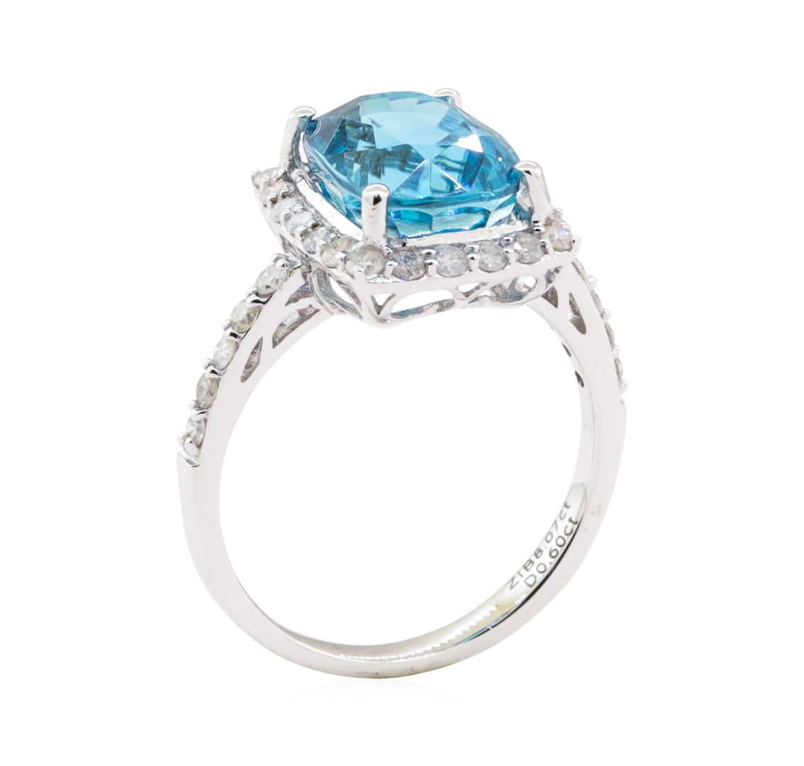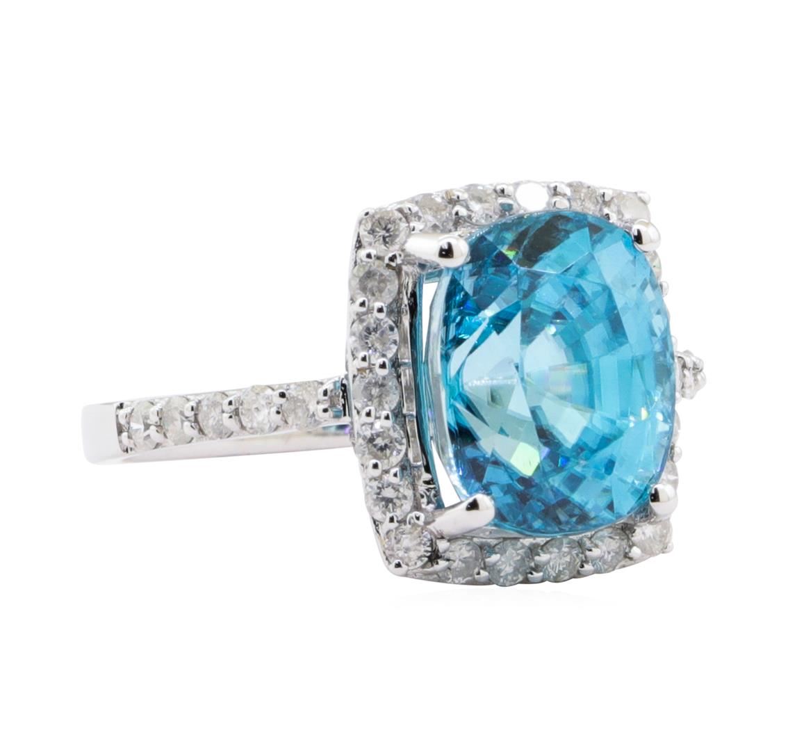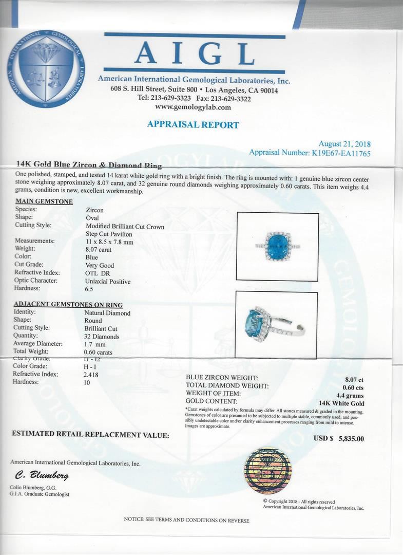 One polished, stamped, and tested 14 karat white gold ling with a bright ?nish. The ring is mounted with: I genuine blue zircon center stone weighing approximately 8.07 carat, and 32 genuine round diamonds weighing approximately 0.60 carats. This item weighs 4.4 grams, condition is new, excellent workmanship. MIAIN GEMSTONE Species: Zircon Shape: Oval Cutting Style: Modi?ed Brilliant Cut Crown Step Cut Pavilion Measurements: 11 x 8.5 x 7,8 mm Weight: 8.07 carat Color: Blue Cut Grade: Very Good Reactive Index: OTL DR Optic Character: Uniaxial Positive Hardness : 6.5 ADJACENT GEMSTONES ON RING Identity: Natural Diamond Shape: Round Cutting Style: Brilliant Cut Quantity: 32 Diamonds Average Diameter: 1.7 mm Total Weight: 0.60 carats Clarity Grade: I1-I2 Color Grade: H - I Refractive Index: 2.418 Hardness: 10 BLUE ZIRCON WEIGHT: 8.07 ct TOTAL DIAMOND WEIGHT: 0.60 cts WEIGHT OF ITEM: 4.4 grams GOLD CONTENT: 14K White Gold ESTIMATED RETAIL REPLACEMENT VALUE: USD $ 5,835.00