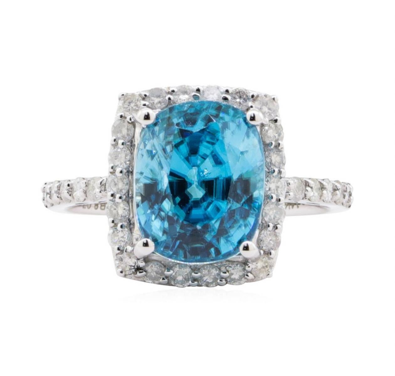 One polished, stamped, and tested 14 karat white gold ling with a bright ?nish. The ring is mounted with: I genuine blue zircon center stone weighing approximately 8.07 carat, and 32 genuine round diamonds weighing approximately 0.60 carats. This item weighs 4.4 grams, condition is new, excellent workmanship. MIAIN GEMSTONE Species: Zircon Shape: Oval Cutting Style: Modi?ed Brilliant Cut Crown Step Cut Pavilion Measurements: 11 x 8.5 x 7,8 mm Weight: 8.07 carat Color: Blue Cut Grade: Very Good Reactive Index: OTL DR Optic Character: Uniaxial Positive Hardness : 6.5 ADJACENT GEMSTONES ON RING Identity: Natural Diamond Shape: Round Cutting Style: Brilliant Cut Quantity: 32 Diamonds Average Diameter: 1.7 mm Total Weight: 0.60 carats Clarity Grade: I1-I2 Color Grade: H - I Refractive Index: 2.418 Hardness: 10 BLUE ZIRCON WEIGHT: 8.07 ct TOTAL DIAMOND WEIGHT: 0.60 cts WEIGHT OF ITEM: 4.4 grams GOLD CONTENT: 14K White Gold ESTIMATED RETAIL REPLACEMENT VALUE: USD $ 5,835.00
