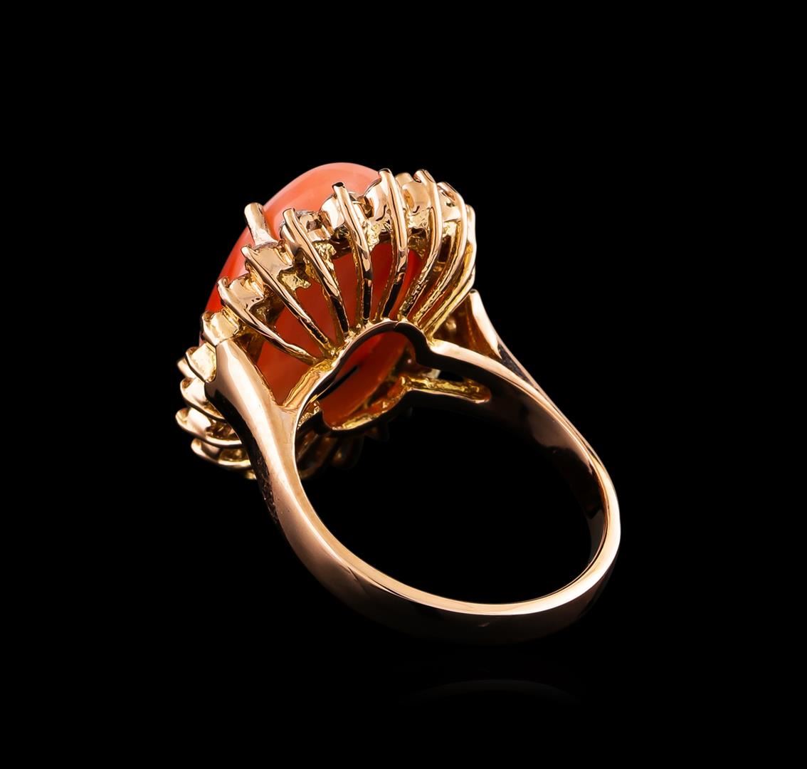 One ring featuring: 14KT rose gold weighing 6.02 grams containing one coral with a total weight of 8.10 and side diamonds with a total weight of 0.70ct.