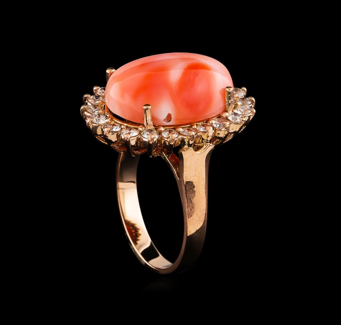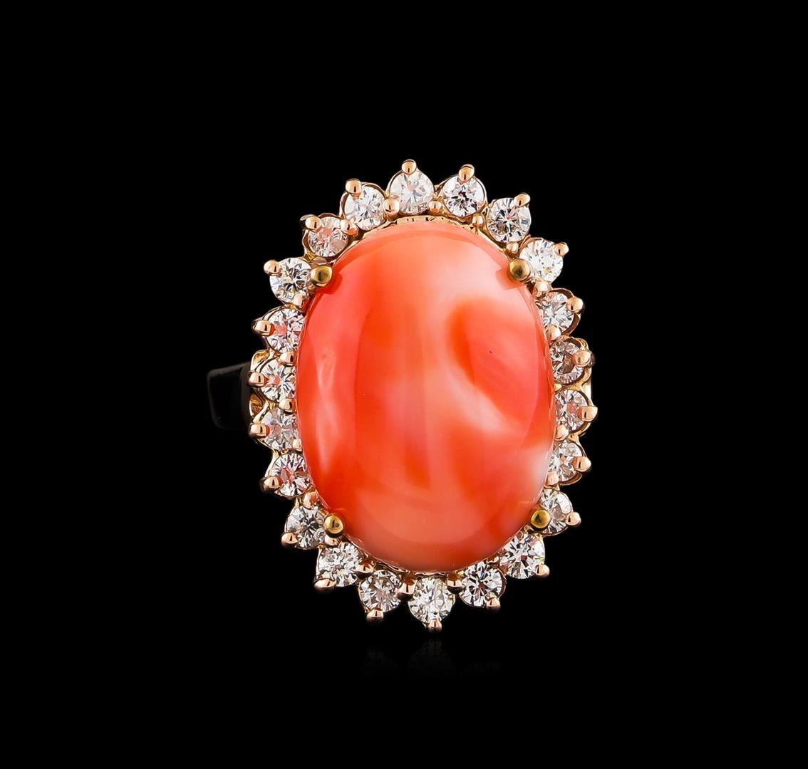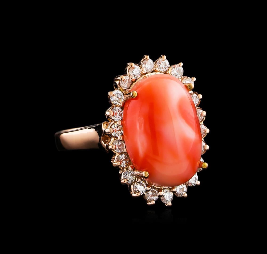 One ring featuring: 14KT rose gold weighing 6.02 grams containing one coral with a total weight of 8.10 and side diamonds with a total weight of 0.70ct.