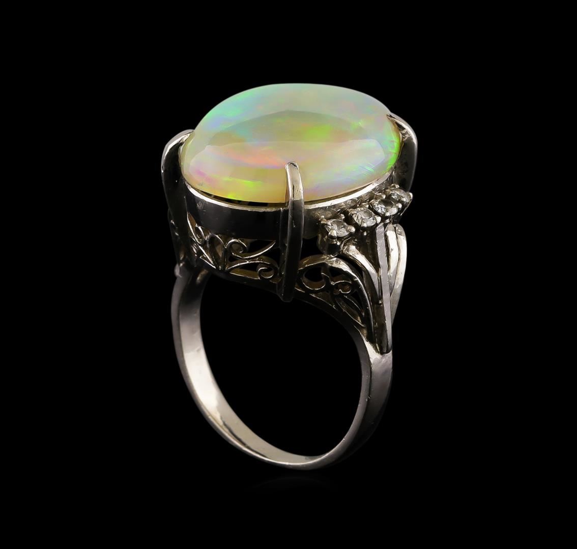 One electronically tested platinum ladies cast opal and diamond ring with a bright polish finish. The featured opal is set between mirroring diamond ribbon accents supported by a filigree lattice under gallery and tapering lattice shoulders, completed by a two millimeter wide band. Identified with markings of 'Pt900'. Condition is good. Containing: One semi crystal opal that is cut in a oval shaped cabochon and is prong set, measuring 18.30 mm long x 13.40 mm wide, and 5.40 mm thick and the approximate weight is 8.26 carats. The opal has a bright, multicolor play of color (fire) in a broad flashfire pattern; a medium dome; a good cut; no inclusions; slight variation in base in its brightness and pattern; and is slightly directional. Graded in the setting. Eight prong set round brilliant cut diamonds, measuring 1.90 - 1.70 x 1.08mm (depth est.) approximate total weight of 8 Stones = 0.20 ct. Graded in the setting. Clarity SI-1 to I-1. Color: G - I. Total Weight of Diamonds 0.20 ct.. Total Weight of Opals 8.26ct.. Total Weight of Ring 8.78gm. AIG Appraised.
