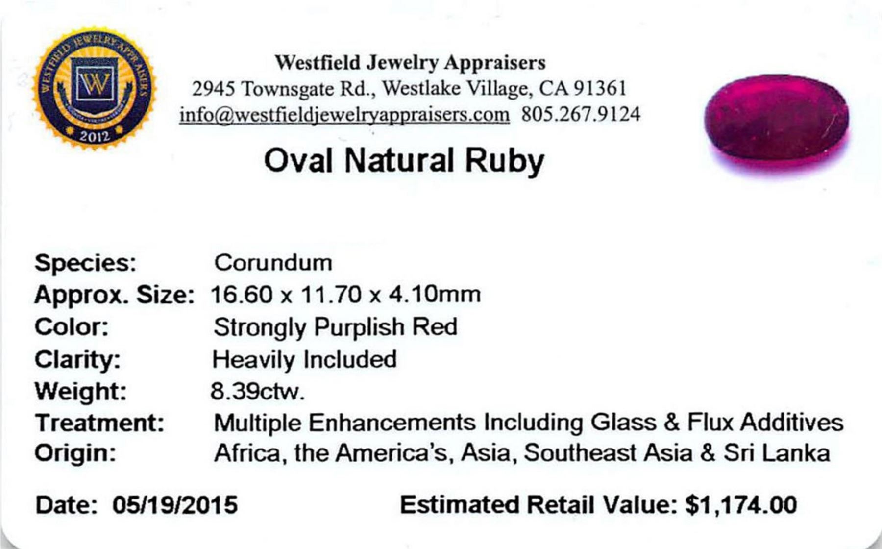 One oval mixed cut natural ruby, measuring 16.60 x 11.70 x 4.10mm, exact weight 8.39ct., clarity is heavily included, type II, dark, very slightly brownish, strongly purplish red color, (GIA stpR 7/3), cut is good. Transmitting light somewhat diffusely, translucent. Naturally occurring internal & external characteristics are present. Indications of laboratory high temperature heat treatment, with glass & flux additives. Westfield Appraised at $1,174.00.