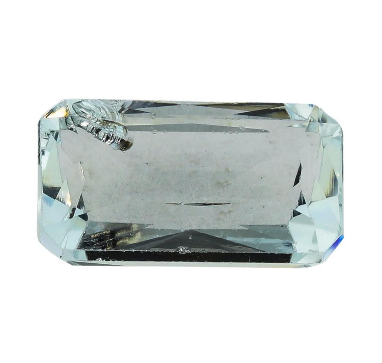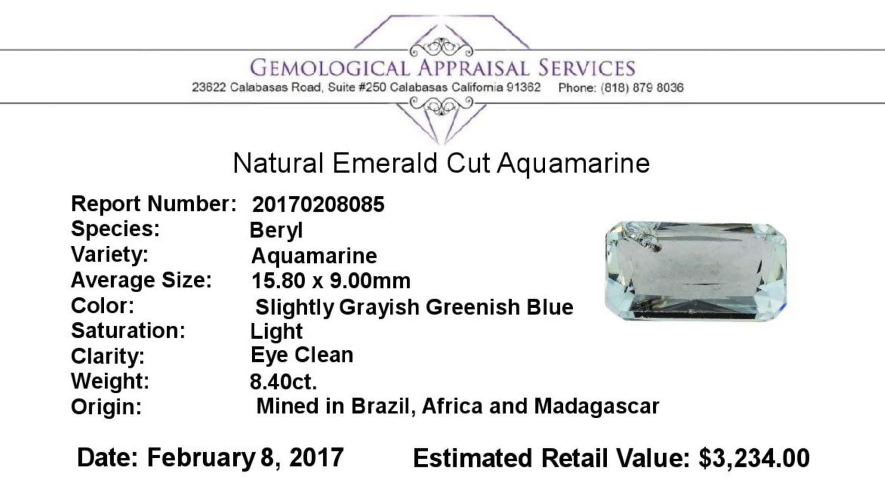 One natural emerald cut aquamarine with an exact weight of 8.40ct., clarity is eye clean, slightly grayish greenish blue, light. Gemological Appraisals Services estimates the retail value at $3234 GAS Appraised.