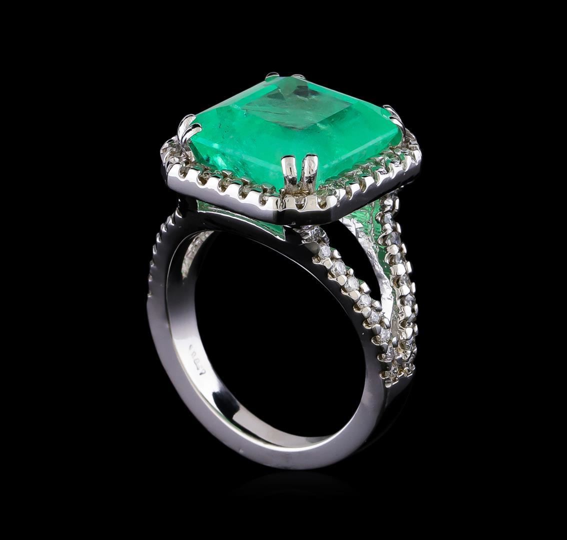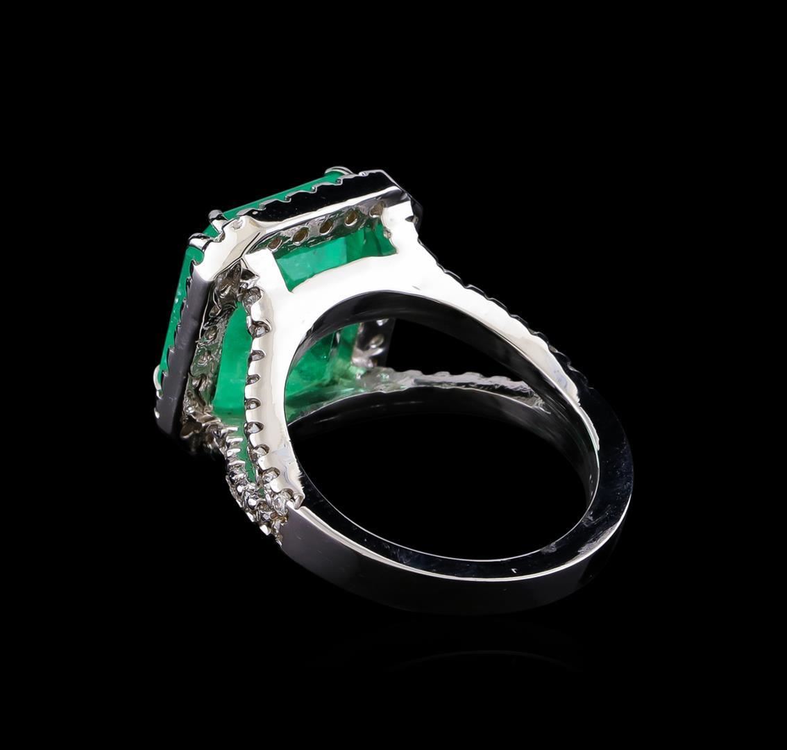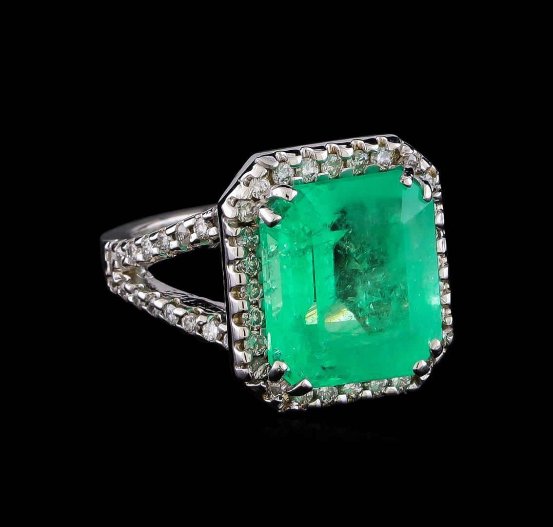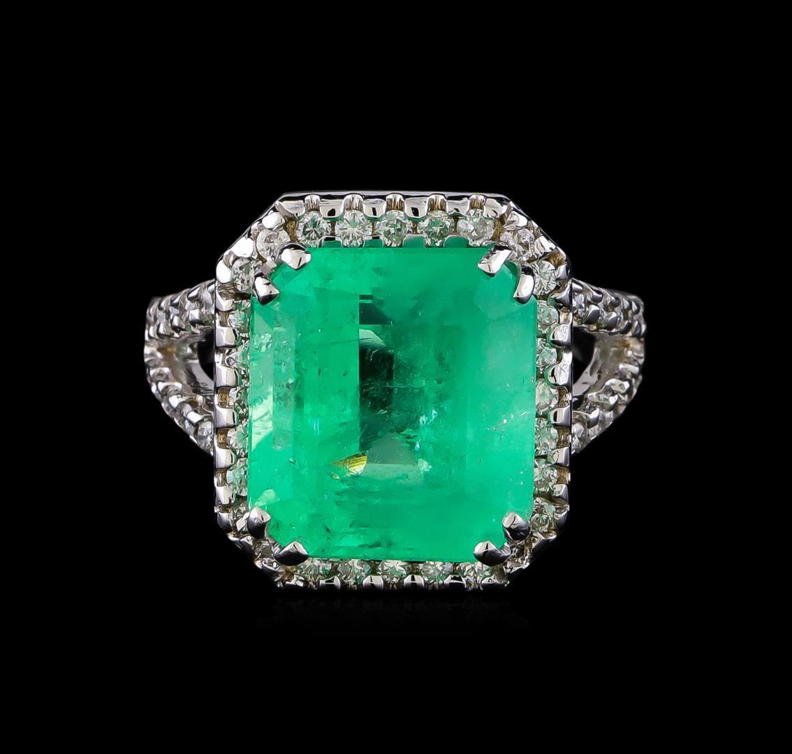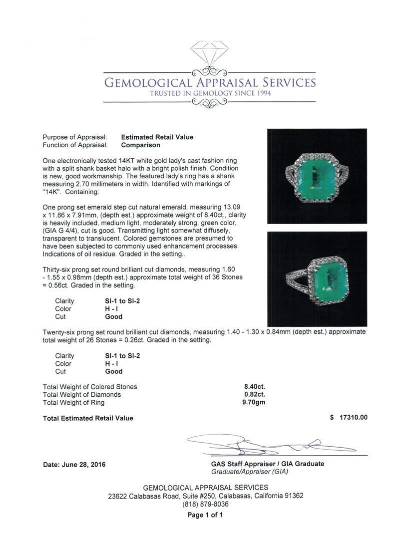 One electronically tested 14KT white gold lady's cast fashion ring with a split shank basket halo with a bright polish finish. The featured lady's ring has a shank measuring 2.70 millimeters in width. Identified with markings of "14K". Condition is new, good workmanship. Containing: One prong set emerald step cut natural emerald, measuring 13.09 x 11.86 x 7.91mm, (depth est.) approximate weight of 8.40ct., clarity is heavily included, medium light, moderately strong, green color, (GIA G 4/4), cut is good. Transmitting light somewhat diffusely, transparent to translucent. Colored gemstones are presumed to have been subjected to commonly used enhancement processes. Indications of oil residue. Graded in the setting. Thirty-Six prong set round brilliant cut diamonds, measuring 1.60 - 1.55 x 0.98mm (depth est.) approximate total weight of 36 Stones = 0.56ct. Graded in the setting. Clarity: SI-1 to SI-2. Color: H - I. Cut Good Twenty-Six prong set round brilliant cut diamonds, measuring 1.40 - 1.30 x 0.84mm (depth est.) approximate total weight of 26 Stones = 0.26ct. Graded in the setting. Clarity: SI-1 to SI-2. Color: H - I. Cut Good. Total Weight of Colored Stones 8.40ct. Total Weight of Diamonds 0.82ct. Total Weight of Ring 9.70gm. GAS Appraised.