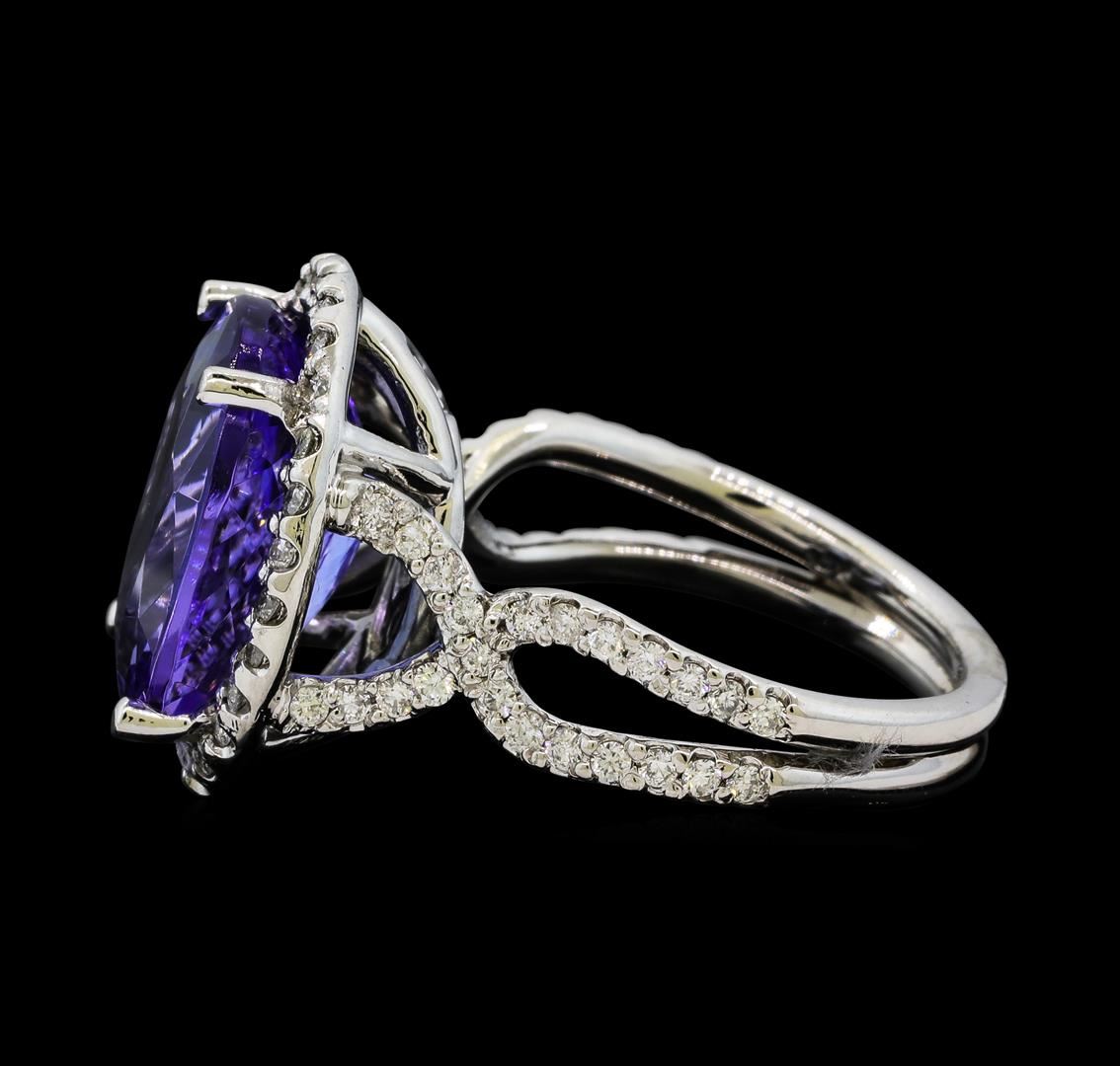 One electronically tested 14KT white gold lady's cast fashion ring with a crossover shank basket halo with a bright polish finish. The featured lady's ring has a double shank measuring 3.15 millimeters wide. Identified with markings of '14K'. Condition is new, good workmanship. Containing: One prong set oval modified brilliant cut natural tanzanite, measuring 14.14 x 11.90 x 6.70mm, (depth est.) 6%. bulge factor, approximate weight of 8.44ct., clarity is eye clean, medium, very slightly grayish, violetish blue color, (GIA vB 5/3), cut is very good. Transmitting light with no distortion, transparent. Colored gemstones are presumed to have been subjected to commonly used enhancement processes. Graded in the setting. Seventy-Four prong set round brilliant cut diamonds, measuring 1.40 - 1.35 x 0.86mm (depth est.) approximate total weight of 74 Stones = 0.73ct. Graded in the setting. Clarity SI-1 to I-1. Color: G - H Cut Good. Total Weight of Colored Stones 8.44ct.. Total Weight of Diamonds 0.73ct.. Total Weight of Ring 7.50gm. GAS Appraised at $13,875.00.