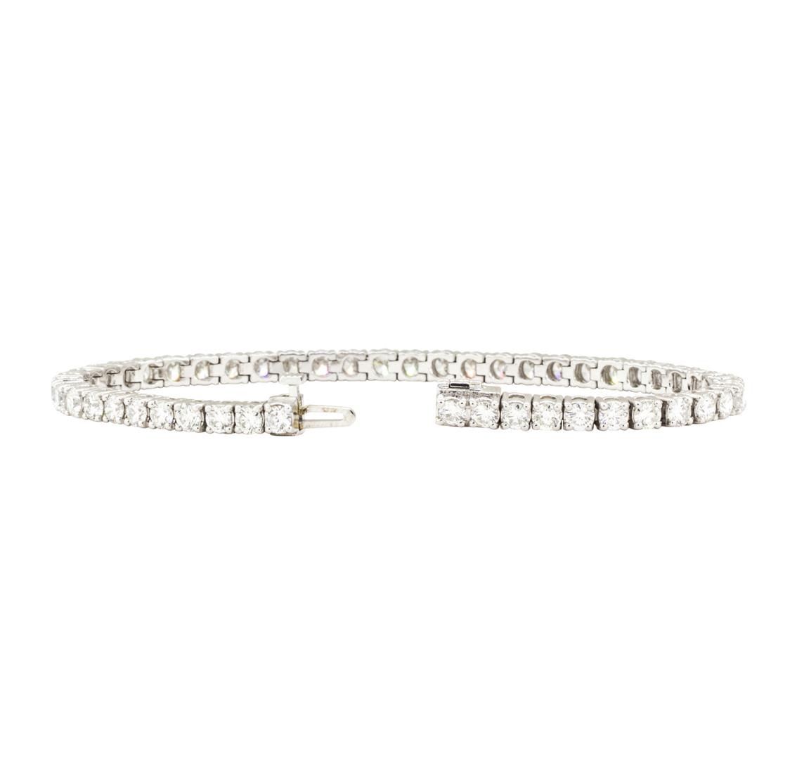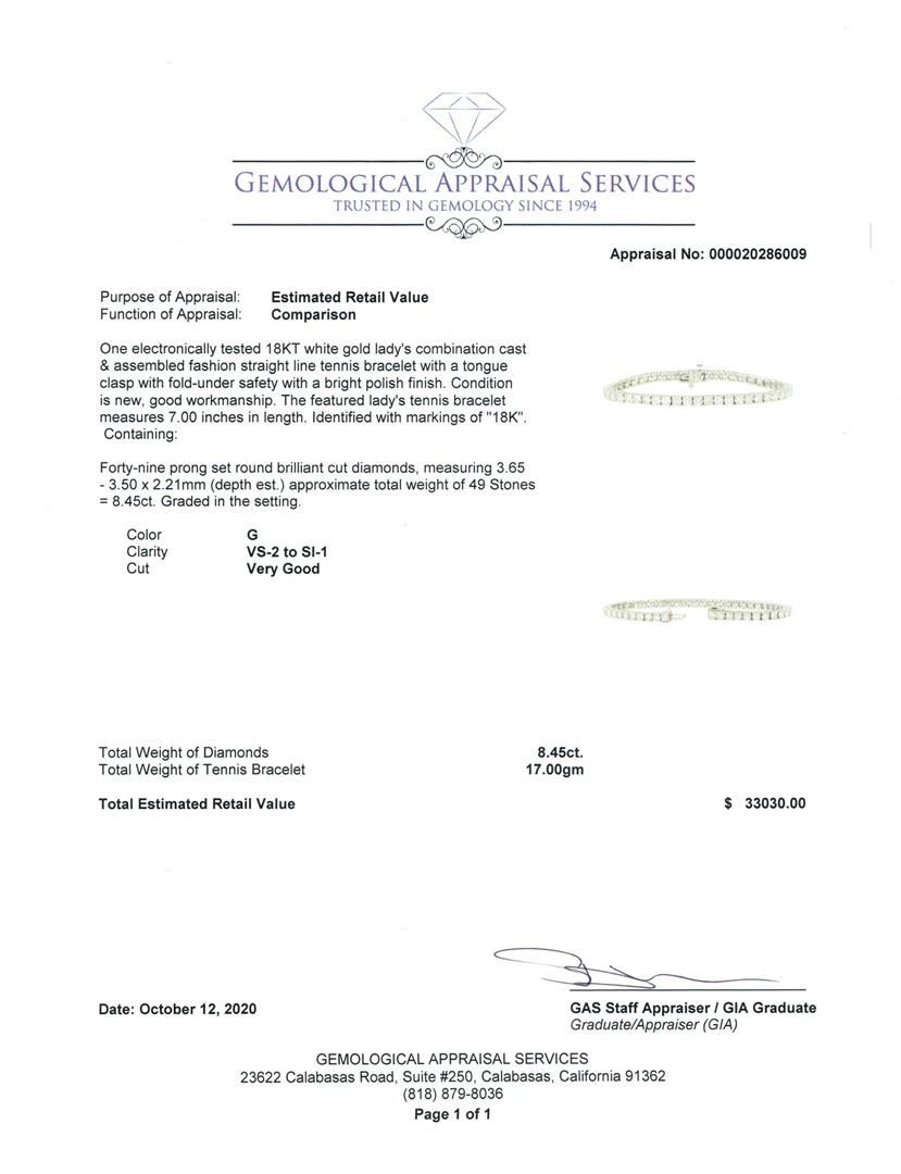 One electronically tested 18KT white gold lady's combination cast & assembled fashion straight line tennis bracelet with a tongue clasp with fold-under safety with a bright polish finish. The featured lady's tennis bracelet measures 7.00 inches in length. Identified with markings of '18K'. Condition is new, good workmanship. Containing: Forty-Nine prong set round brilliant cut diamonds, measuring 3.65 - 3.50 x 2.21mm (depth est.) approximate total weight of 49 Stones = 8.45ct. Graded in the setting. Color G Clarity VS-2 to SI-1 Cut Very Good. Total Weight of Diamonds 8.45ct.. Total Weight of Tennis Bracelet 17.00gm GAS Appraised at $33030.00. GAS Appraised.