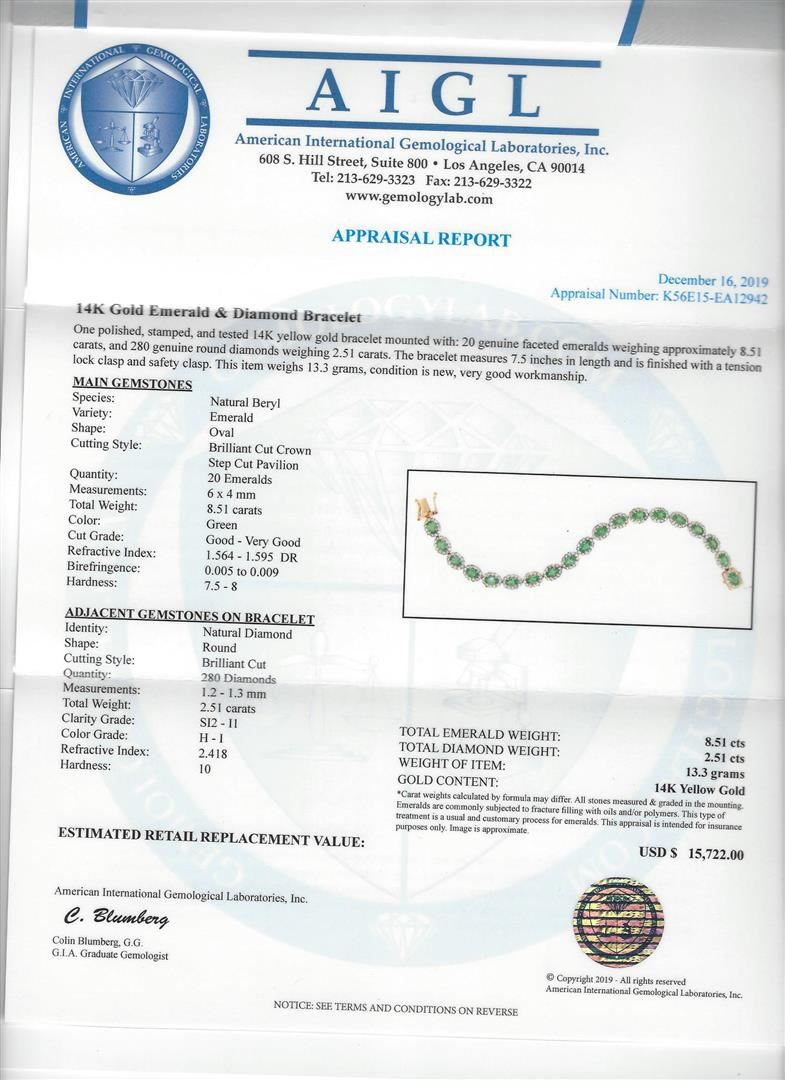 One 8.51ctw Emerald and Diamond Bracelet - 14KT Yellow Gold. AIG certified. See Appraisal for more details. AIG Appraised.