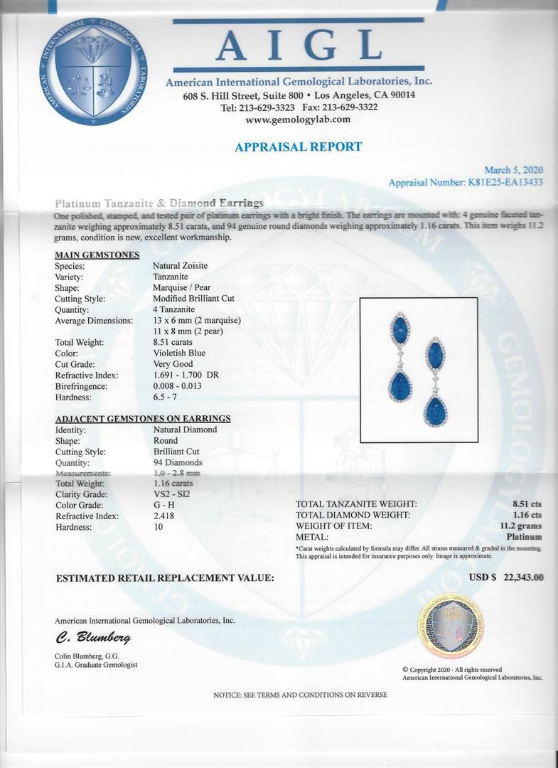 One 8.51ctw Tanzanite and Diamond Earrings - Platinum. AIG certified. See Appraisal for more details. AIG Appraised.