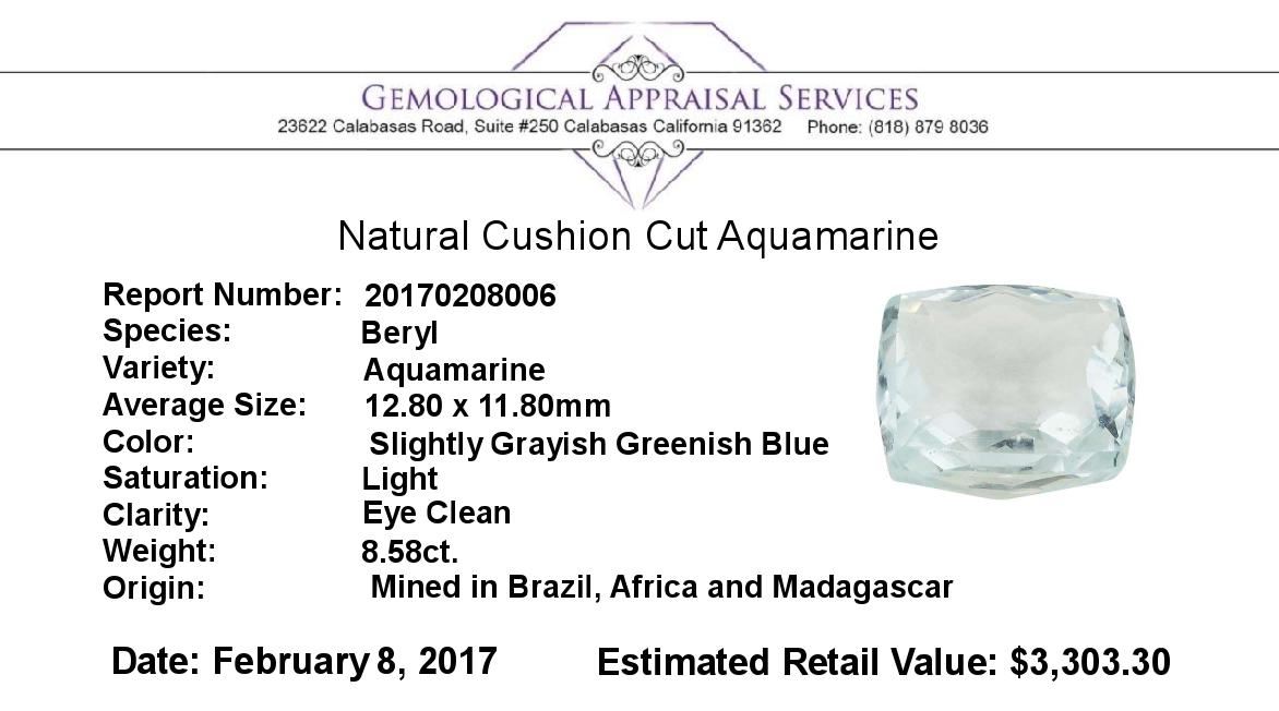 One natural cushion cut aquamarine with an exact weight of 8.58ct., clarity is eye clean, slightly grayish greenish blue, light. Gemological Appraisals Services estimates the retail value at $3303.3 GAS Appraised.