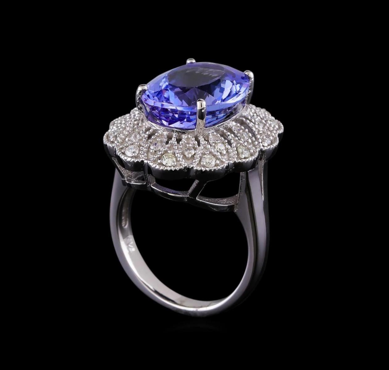One electronically tested 14KT white gold lady's cast fashion ring with a basket halo with a bright polish with milgrain detailing finish. The featured lady's has a shank measuring 2.78 millimeters in width. Identified with markings of "K14". Condition is new, good workmanship. Containing: One prong set oval modified brilliant cut natural tanzanite, measuring 14.45 x 11.38 x 7.97mm, (depth est.) approximate weight of 8.58ct., clarity is eye clean, medium light, very slightly grayish, violetish blue color, (GIA vB 4/3), cut is good. Transmitting light with no distortion, transparent. Colored gemstones are presumed to have been subjected to commonly used enhancement processes. Graded in the setting. Twelve prong set round brilliant cut diamonds, measuring 1.80 - 1.75 x 1.11mm (depth est.) approximate total weight of 12 Stones = 0.26ct. Graded in the setting. Clarity: SI-1 to SI-2. Color: G - Good Twelve prong set round brilliant cut diamonds, measuring 1.50 - 1.40 x 0.90mm (depth est.) approximate total weight of 12 Stones = 0.14ct. Graded in the setting. Clarity: SI-1 to SI-2. Color: G - Good. Total Weight of Colored Stones 8.58ct. Total Weight of Diamonds 0.40ct. Total Weight of Ring 10.10gm.