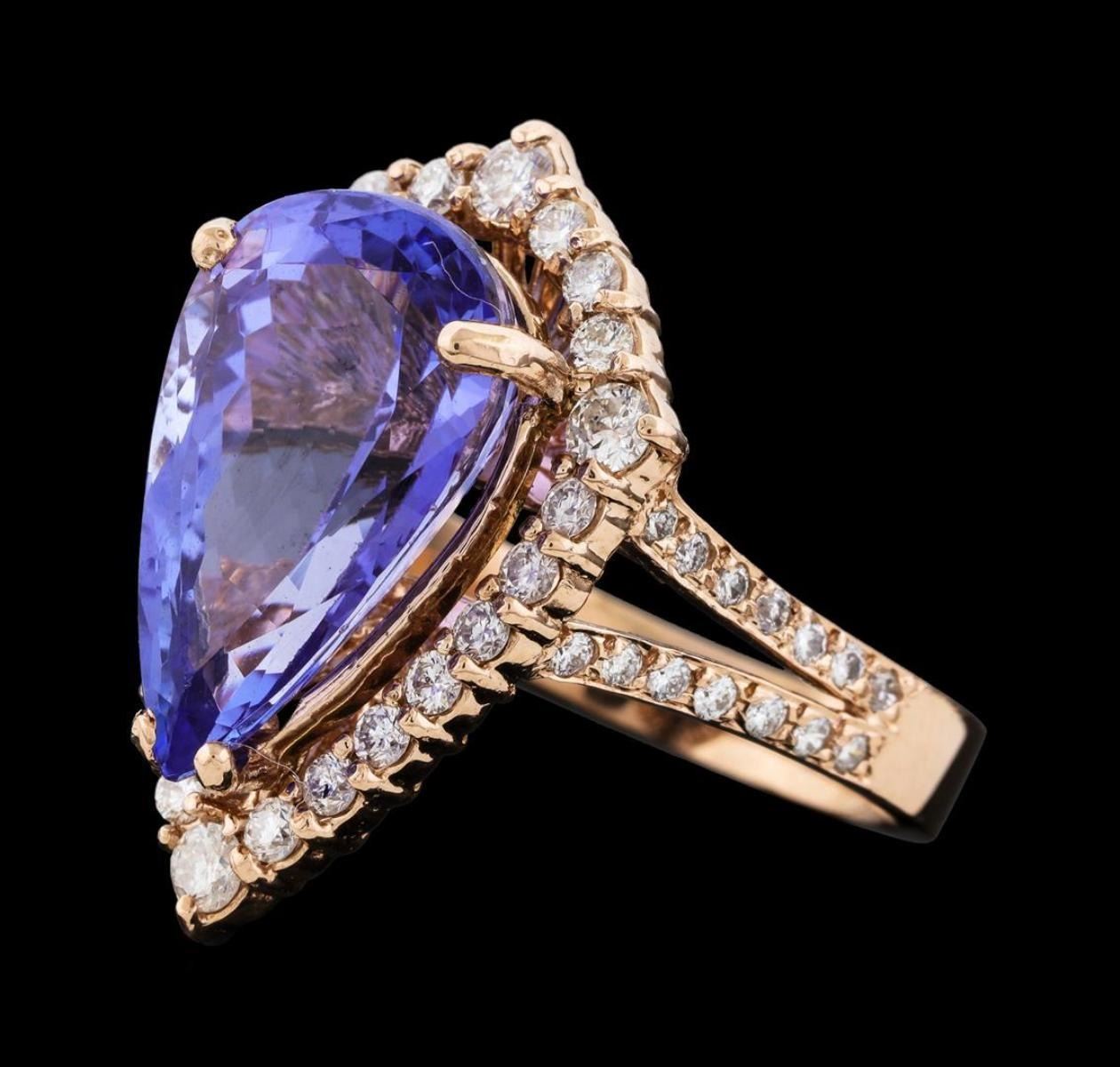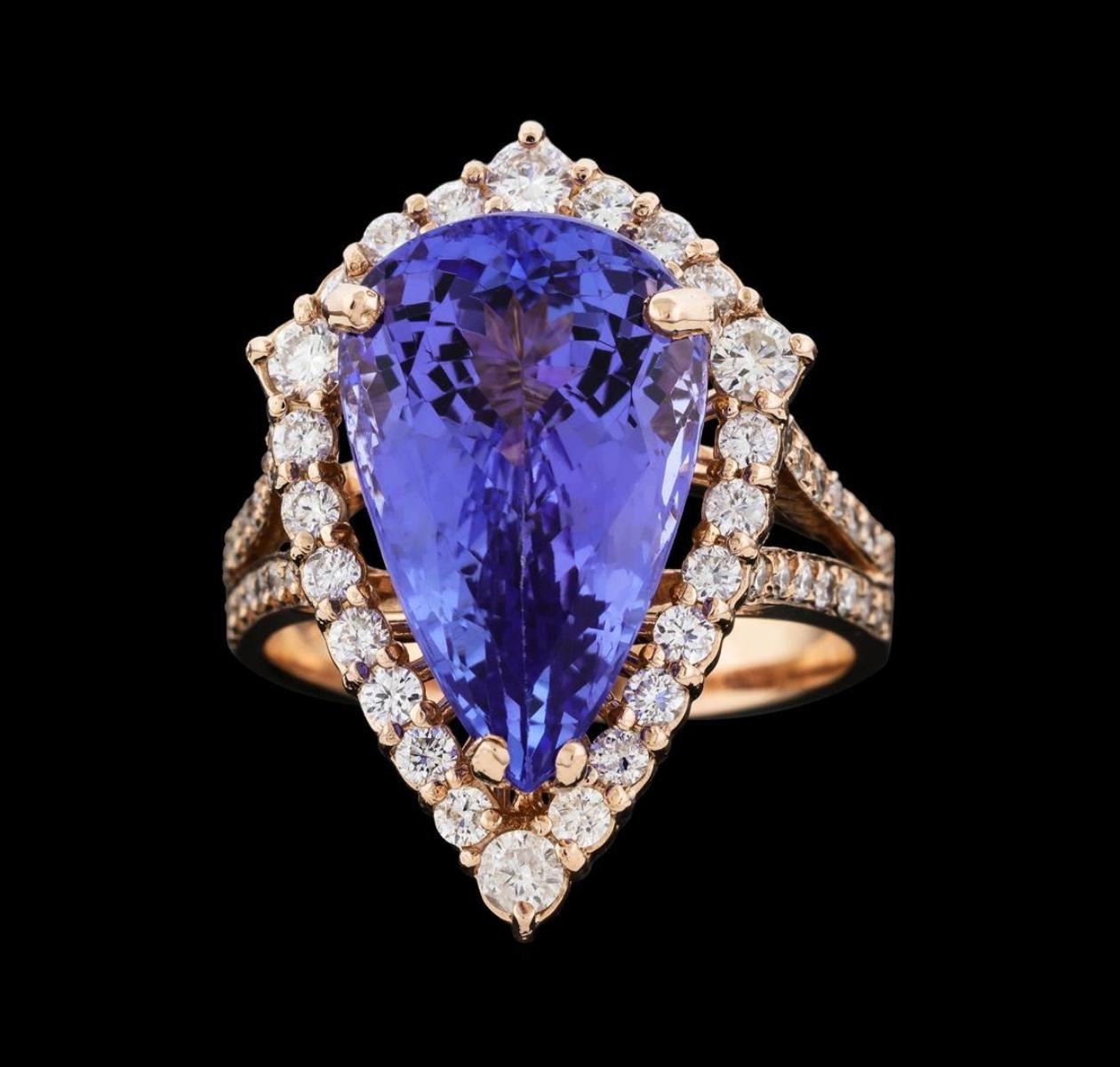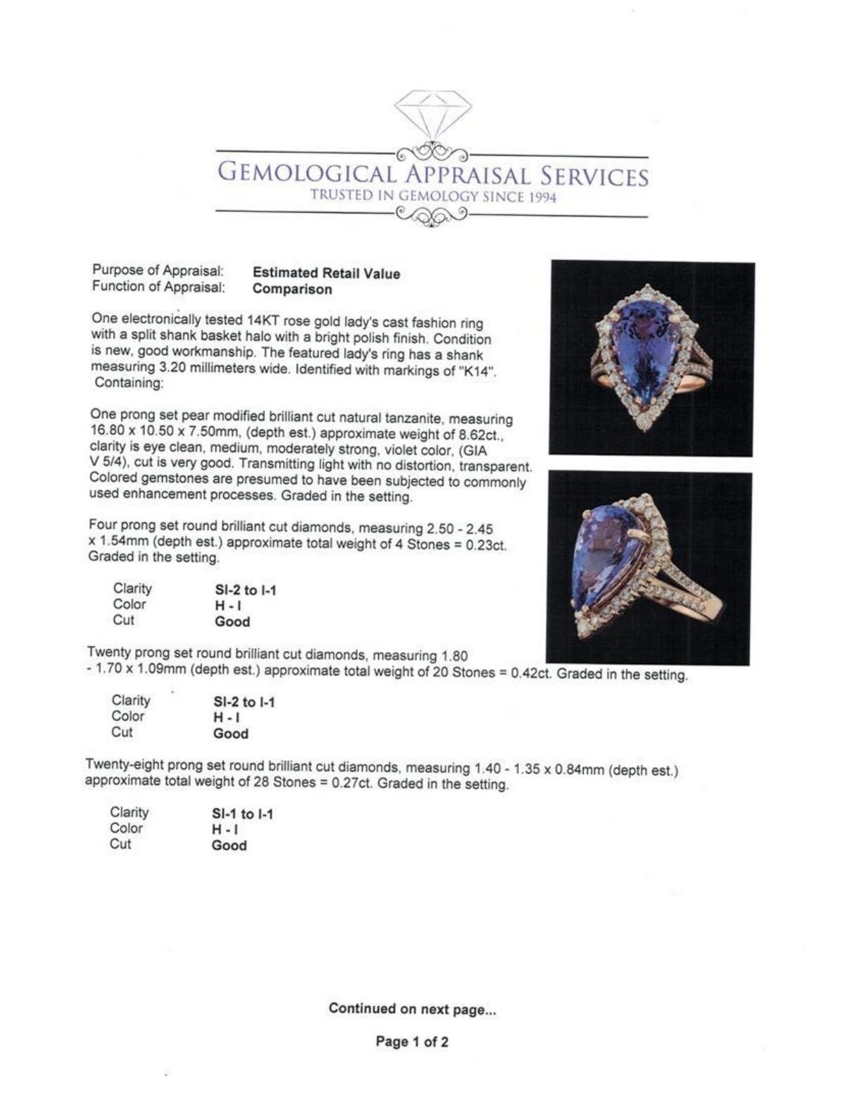 One electronically tested 14KT rose gold lady's cast fashion ring with a split shank basket halo with a bright polish finish. The featured lady's ring has a shank measuring 3.20 millimeters wide. Identified with markings of 'K14'. Condition is new, good workmanship. Containing: One prong set pear modified brilliant cut natural tanzanite, measuring 16.80 x 10.50 x 7.50mm, (depth est.) approximate weight of 8.62ct., clarity is eye clean, medium, moderately strong, violet color, (GIA V 5/4), cut is very good. Transmitting light with no distortion, transparent. Colored gemstones are presumed to have been subjected to commonly used enhancement processes. Graded in the setting. Four prong set round brilliant cut diamonds, measuring 2.50 - 2.45 x 1.54mm (depth est.) approximate total weight of 4 Stones = 0.23ct. Graded in the setting. Clarity SI-2 to I-1. Color: H - I Cut Good Twenty prong set round brilliant cut diamonds, measuring 1.80 - 1.70 x 1.09mm (depth est.) approximate total weight of 20 Stones = 0.42ct. Graded in the setting. Clarity SI-2 to I-1. Color: H - I Cut Good Twenty-Eight prong set round brilliant cut diamonds, measuring 1.40 - 1.35 x 0.84mm (depth est.) approximate total weight of 28 Stones = 0.27ct. Graded in the setting. Clarity SI-1 to I-1. Color: H - I Cut Good. Total Weight of Colored Stones 8.62ct.. Total Weight of Diamonds 0.92ct.. Total Weight of Ring 8.30gm. GAS Appraised.