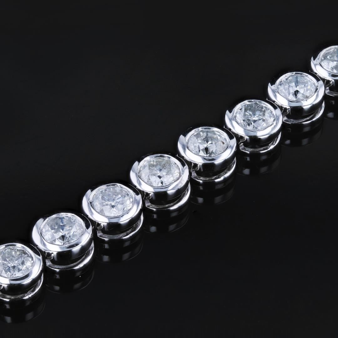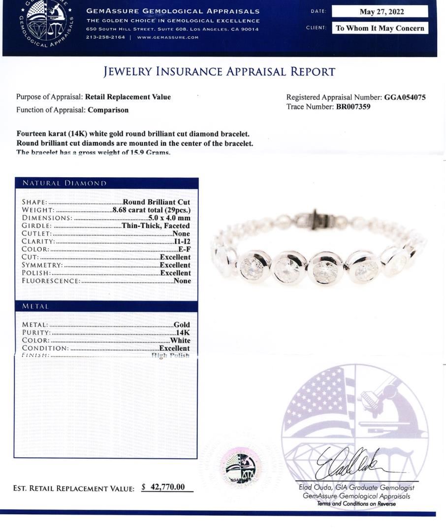 Fourteen karat (14K) white gold round brilliant cut diamond bracelet. Round brilliant cut diamonds are mounted in the center of the bracelet. The bracelet has a gross weight of 15.9 Grams. NATURAL DIAMOND SHAPE: Round Brilliant Cut WEIGHT: 8.68 carat total (29pcs.) DIMENSIONS: 5.0 x 4.0mm GIRDL E: Thin-Thick, Faceted CUTLET: None CLARITY: I1 to I2 COLOR: E - F CUT: Excellent SYMMETRY: Excellent POLISH: Excellent FLUORESCENCE: None METAL METAL: Gold PURITY: 14K COLOR: White CONDITION: Excellent FINISH: High Polish