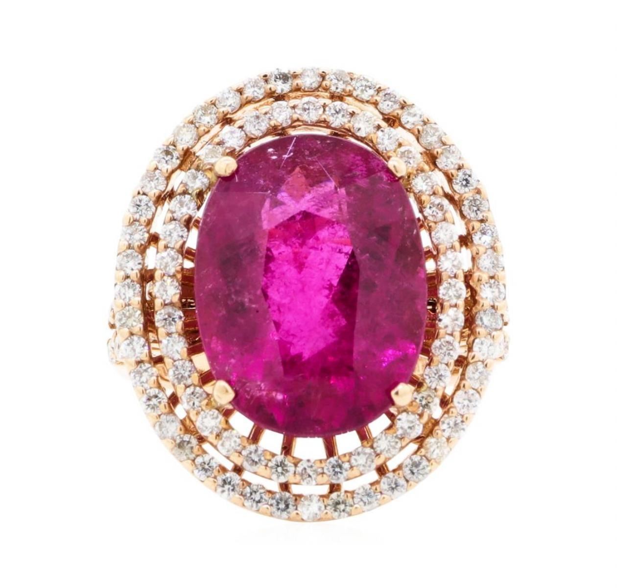 One electronically tested 14KT rose gold lady's cast fashion ring with a double basket halo with a bright polish finish. The featured lady's ring has a shank measuring 2.90 millimeters wide. Identified with markings of '14K'. Condition is new, good workmanship. Containing: One prong set oval modified mixed cut natural rubellite, measuring 14.83 x 11.13 x 6.68mm, (depth est.) 10%. bulge factor, approximate weight of 7.76ct., clarity is heavily included, medium dark, very slightly brownish, slightly purplish red color, (GIA slpR 6/3), cut is very good. Transmitting light somewhat diffusely, semi-transparent to translucent. Colored gemstones are presumed to have been subjected to commonly used enhancement processes. Graded in the setting. One Hundred prong set round brilliant cut diamonds, measuring 1.40 - 1.30 x 0.84mm (depth est.) approximate total weight of 100 Stones = 0.93ct. Graded in the setting. Color H - I Clarity SI-1 to I-1 Cut Good. Total Weight of Colored Stones 7.76ct.. Total Weight of Diamonds 0.93ct.. Total Weight of Ring 7.70gm GAS Appraised at $10655.00. GAS Appraised.