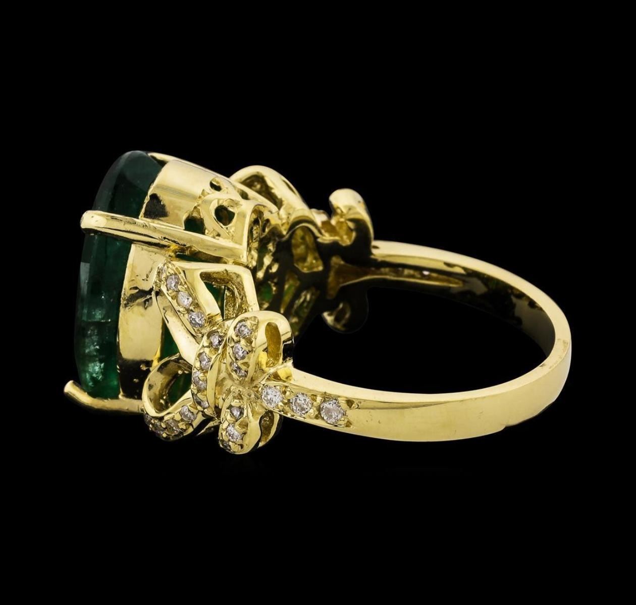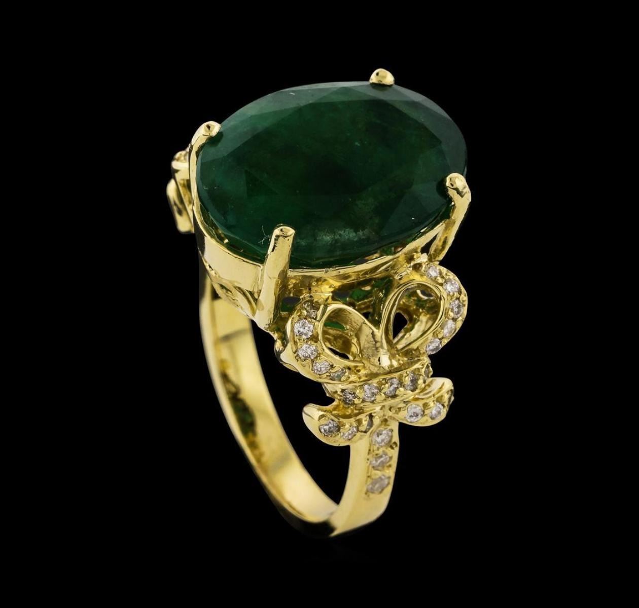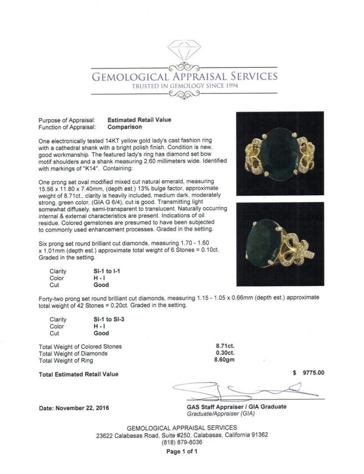 One electronically tested 14KT yellow gold lady's cast fashion ring with a cathedral shank with a bright polish finish. The featured lady's ring has diamond set bow motif shoulders and a shank measuring 2.60 millimeters wide. Identified with markings of 'K14'. Condition is new, good workmanship. Containing: One prong set oval modified mixed cut natural emerald, measuring 15.56 x 11.80 x 7.40mm, (depth est.) 13%. bulge factor, approximate weight of 8.71ct., clarity is heavily included, medium dark, moderately strong, green color, (GIA G 6/4), cut is good. Transmitting light somewhat diffusely, semi-transparent to translucent. Naturally occurring internal & external characteristics are present. Indications of oil residue. Colored gemstones are presumed to have been subjected to commonly used enhancement processes. Graded in the setting. Six prong set round brilliant cut diamonds, measuring 1.70 - 1.60 x 1.01mm (depth est.) approximate total weight of 6 Stones = 0.10ct. Graded in the setting. Clarity SI-1 to I-1. Color: H - I Cut Good Forty-Two prong set round brilliant cut diamonds, measuring 1.15 - 1.05 x 0.66mm (depth est.) approximate total weight of 42 Stones = 0.20ct. Graded in the setting. Clarity SI-1 to SI-3. Color: H - I Cut Good. Total Weight of Colored Stones 8.71ct.. Total Weight of Diamonds 0.30ct.. Total Weight of Ring 8.60gm. GAS Appraised.