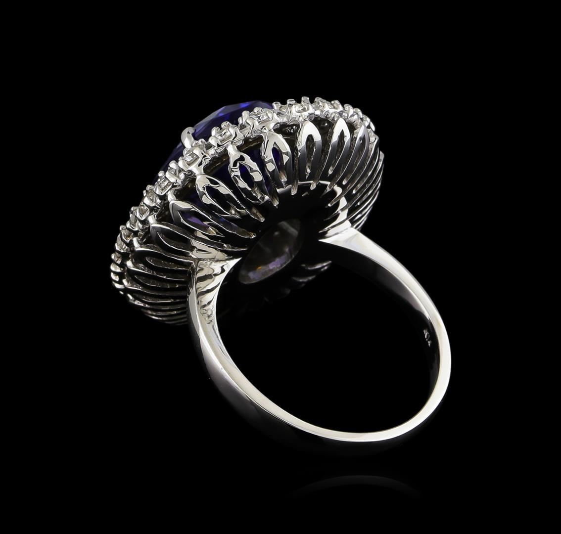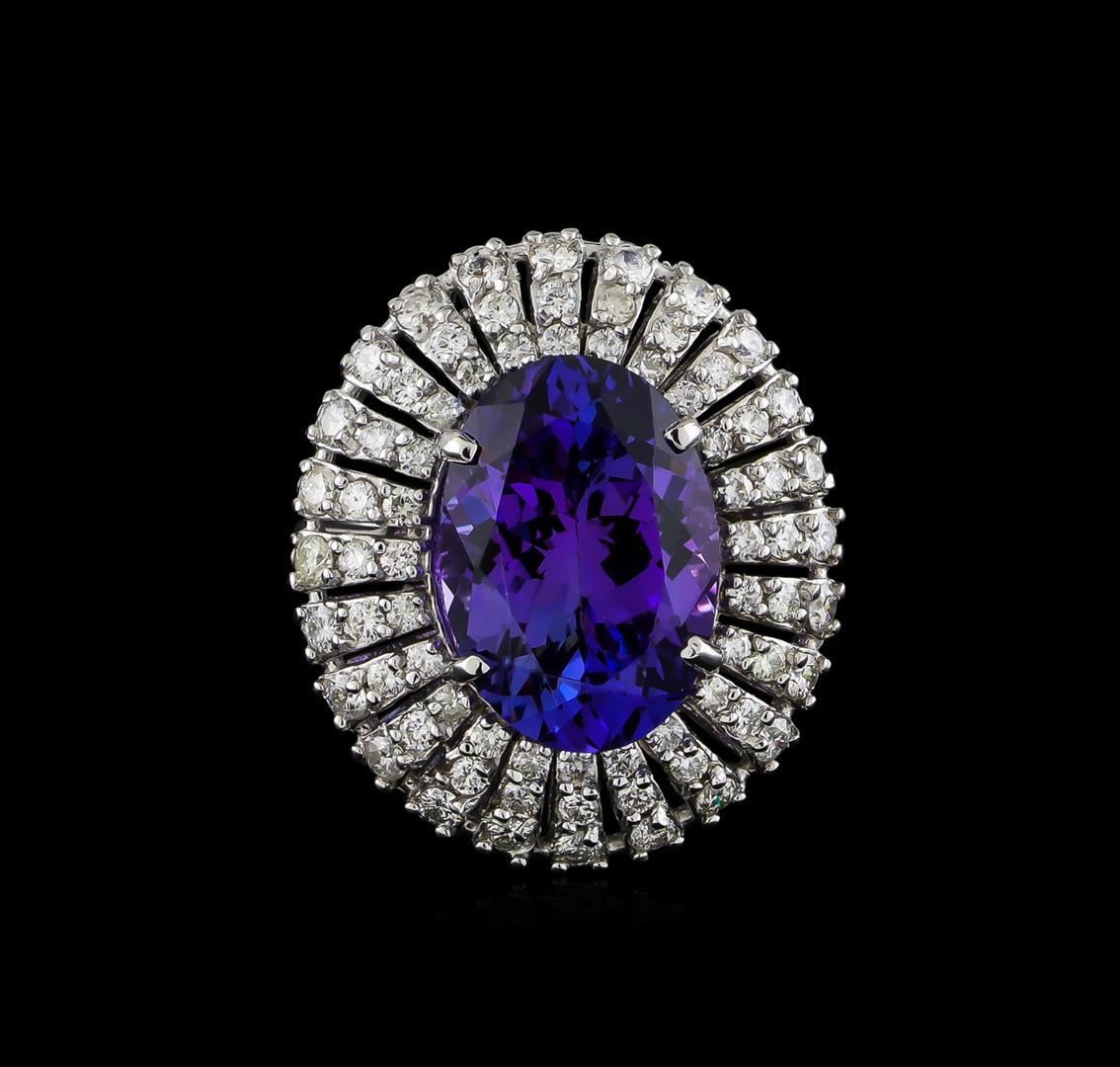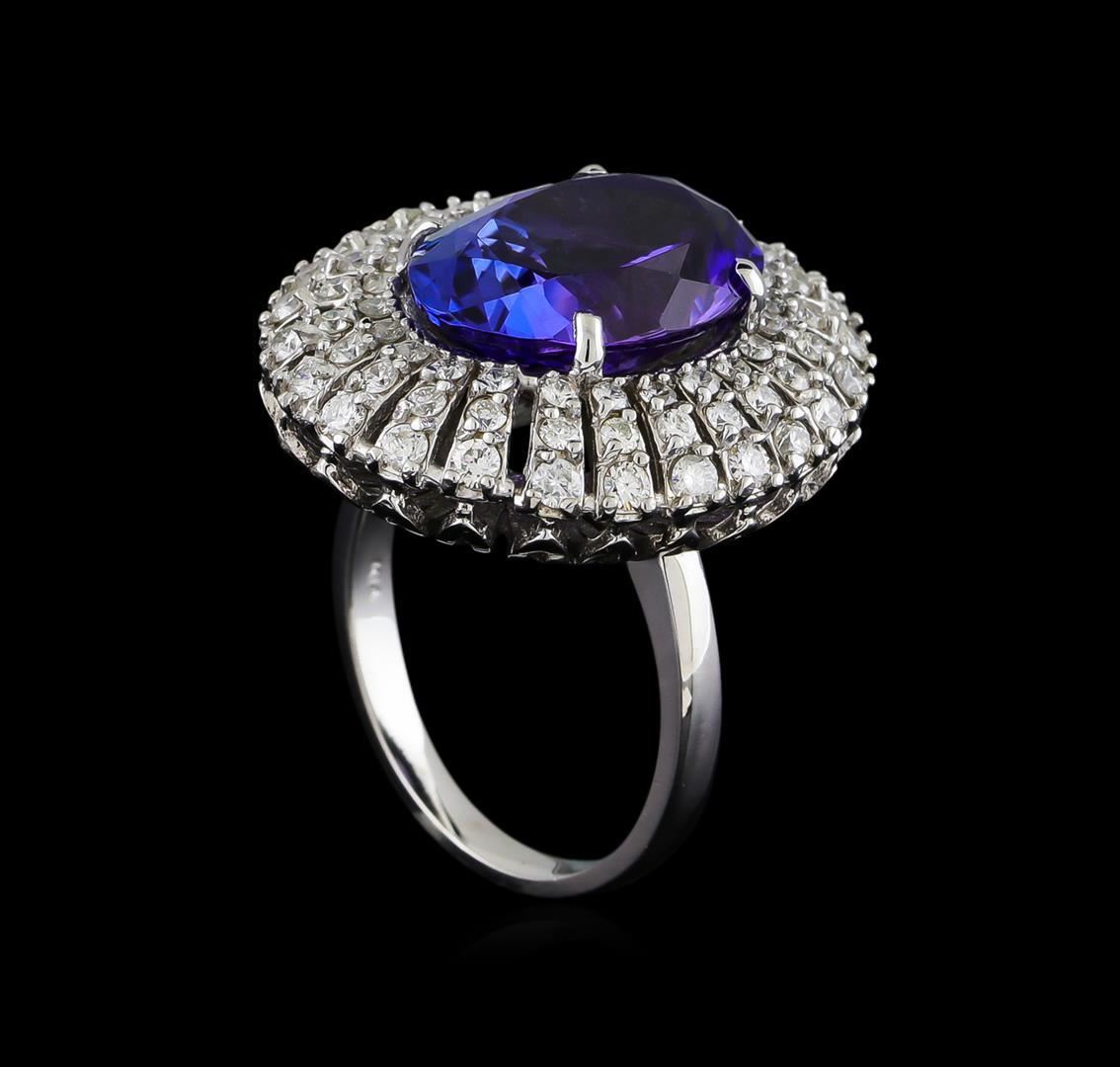 One electronically tested 14KT white gold ladies cast tanzanite and diamond ring with a bright polish finish. The featured tanzanite is set within a stylized diamond bezel supported by a ribbed under gallery, completed by a two millimeter wide band. Identified with markings of "K14". Condition is new, good workmanship. Containing: One prong set oval mixed cut natural tanzanite, measuring 15.30 x 10.80 x 7.50mm, approximate weight of 8.72ct., clarity is eye clean, type I, medium dark, very slightly grayish, bluish violet color, (GIA bV 6/3), cut is good. Transmitting light with no distortion, transparent. Colored Stone Grading Report attached. Graded in the setting. Tanzanite is a very rare gemstone that is only found in the country of Tanzania. Originally discovered in 1967. Tiffany & Company, named the stone Tanzanite. It is found in the Usumburu Mountains that border the Umba Valley of northern Tanzania. Tanzanite occurs in gray, brown, violet, blue, reddish-purple, & green. The gem is interesting because of its exceptional pleochroism. Rotated in different directions a tanzanite will exhibit multiple changes of color. Tanzanite has a low tolerance to ultrasonic cleaning, and should not be cleaned using this method. Twenty-Four prong set round brilliant cut diamonds, measuring 2.00 - 1.90 x 1.17mm (depth est.) approximate total weight of 24 Stones = 0.65ct. Graded in the setting. Clarity: SI-2 to I-2. Color: G - I Twenty-Four prong set round brilliant cut diamonds, measuring 1.60 - 1.60 x 0.96mm (depth est.) approximate total weight of 24 Stones = 0.36ct. Graded in the setting. Clarity: SI-2 to I-2. Color: G - I Twenty-Four prong set round brilliant cut diamonds, measuring 1.50 - 1.50 x 0.90mm (depth est.) approximate total weight of 24 Stones = 0.30ct. Graded in the setting. Clarity: SI-2 to I-2. Color: G - I. Total Weight of Colored Stones 8.72ct. Total Weight of Diamonds 1.31ct. Total Weight of Ring 10.90gm. AIG Appraised.
