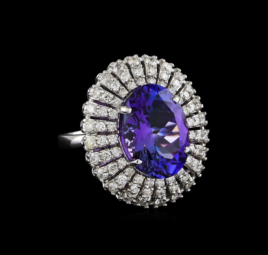 One electronically tested 14KT white gold ladies cast tanzanite and diamond ring with a bright polish finish. The featured tanzanite is set within a stylized diamond bezel supported by a ribbed under gallery, completed by a two millimeter wide band. Identified with markings of "K14". Condition is new, good workmanship. Containing: One prong set oval mixed cut natural tanzanite, measuring 15.30 x 10.80 x 7.50mm, approximate weight of 8.72ct., clarity is eye clean, type I, medium dark, very slightly grayish, bluish violet color, (GIA bV 6/3), cut is good. Transmitting light with no distortion, transparent. Colored Stone Grading Report attached. Graded in the setting. Tanzanite is a very rare gemstone that is only found in the country of Tanzania. Originally discovered in 1967. Tiffany & Company, named the stone Tanzanite. It is found in the Usumburu Mountains that border the Umba Valley of northern Tanzania. Tanzanite occurs in gray, brown, violet, blue, reddish-purple, & green. The gem is interesting because of its exceptional pleochroism. Rotated in different directions a tanzanite will exhibit multiple changes of color. Tanzanite has a low tolerance to ultrasonic cleaning, and should not be cleaned using this method. Twenty-Four prong set round brilliant cut diamonds, measuring 2.00 - 1.90 x 1.17mm (depth est.) approximate total weight of 24 Stones = 0.65ct. Graded in the setting. Clarity: SI-2 to I-2. Color: G - I Twenty-Four prong set round brilliant cut diamonds, measuring 1.60 - 1.60 x 0.96mm (depth est.) approximate total weight of 24 Stones = 0.36ct. Graded in the setting. Clarity: SI-2 to I-2. Color: G - I Twenty-Four prong set round brilliant cut diamonds, measuring 1.50 - 1.50 x 0.90mm (depth est.) approximate total weight of 24 Stones = 0.30ct. Graded in the setting. Clarity: SI-2 to I-2. Color: G - I. Total Weight of Colored Stones 8.72ct. Total Weight of Diamonds 1.31ct. Total Weight of Ring 10.90gm. AIG Appraised.