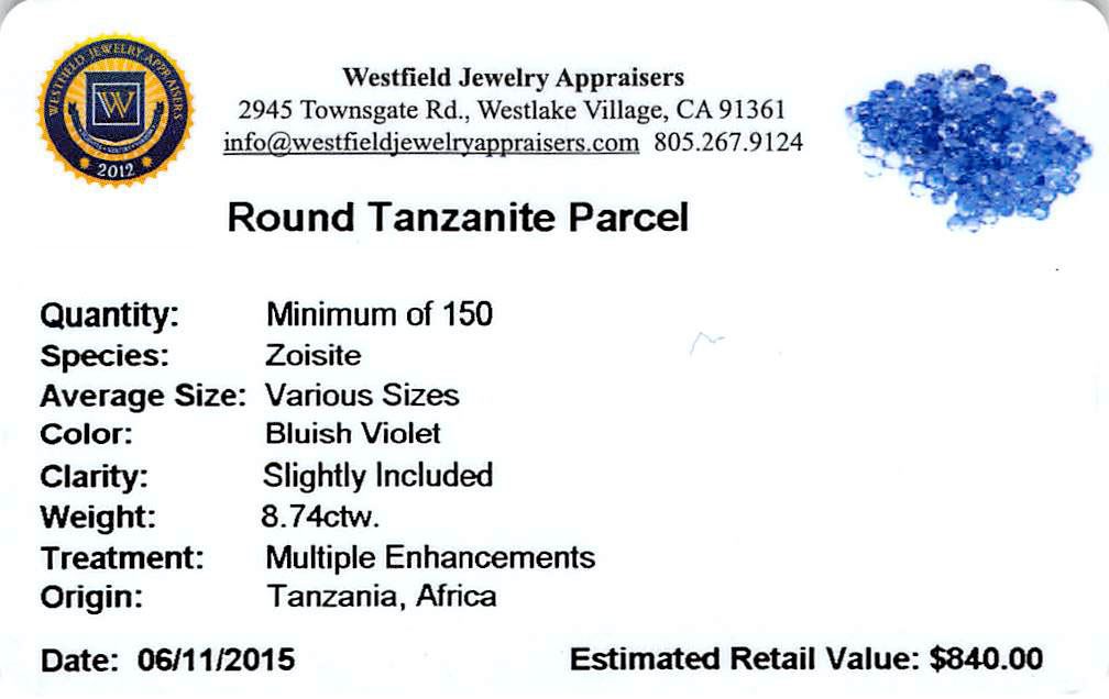 One hundred fifty round mixed cut natural tanzanites exact total weight 8.74ct., clarity is eye clean, type I, medium dark, very slightly grayish, bluish violet color, (GIA bV 6/3), cut is good. Transmitting light with no distortion, transparent. Color grade is an average for the group. Graded in the setting. Tanzanite is a very rare gemstone that is only found in the country of Tanzania. Originally discovered in 1967. Tiffany & Company, named the stone Tanzanite. It is found in the Usumburu Mountains that border the Umba Valley of northern Tanzania. Tanzanite occurs in gray, brown, violet, blue, reddish-purple, & green. The gem is interesting because of its exceptional pleochroism. Rotated in different directions a tanzanite will exhibit multiple changes of color. Tanzanite has a low tolerance to ultrasonic cleaning, and should not be cleaned using this method. Westfield Appraised.