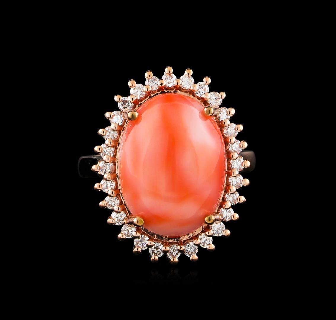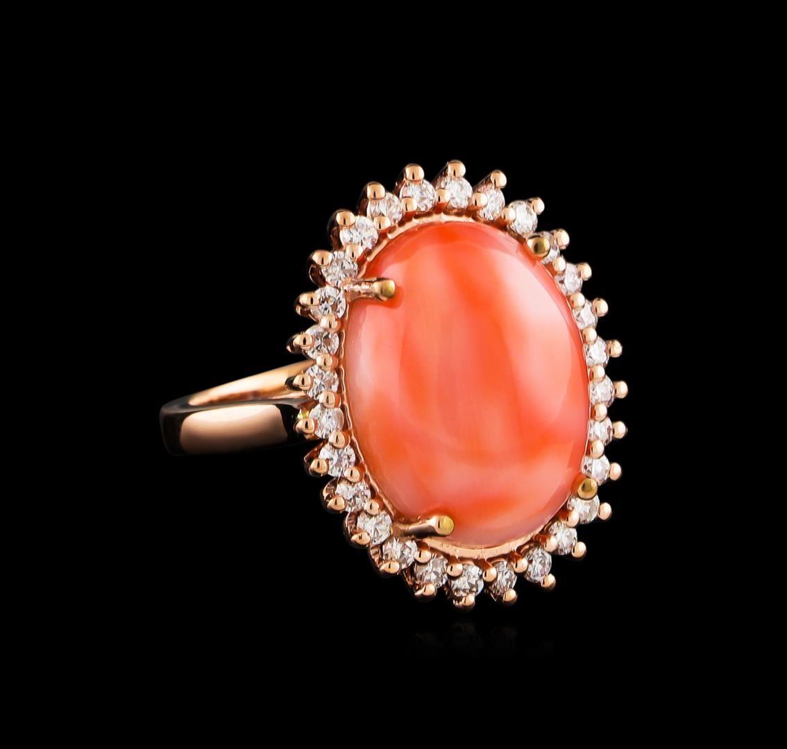 One ring featuring: 14KT rose gold weighing 6.65 grams containing one coral with a total weight of 8.75 and side diamonds with a total weight of 0.58ct.