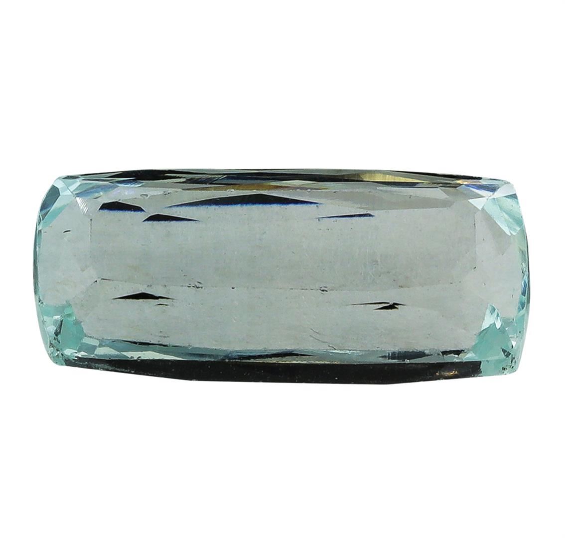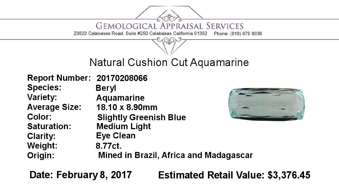 One natural cushion cut aquamarine with an exact weight of 8.77ct., clarity is eye clean, slightly greenish blue, medium light. Gemological Appraisals Services estimates the retail value at $3376.45 GAS Appraised.