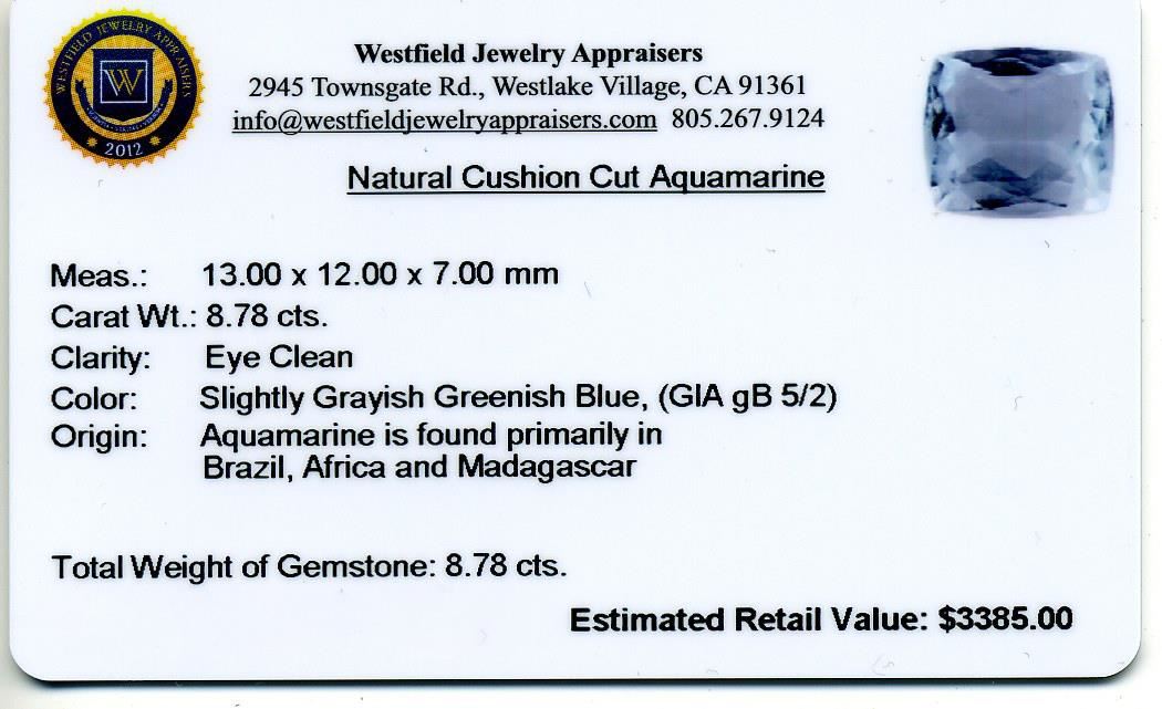 8.78ct Cushion Cut Natural Cushion Cut Aquamarine. Westfield Appraised.