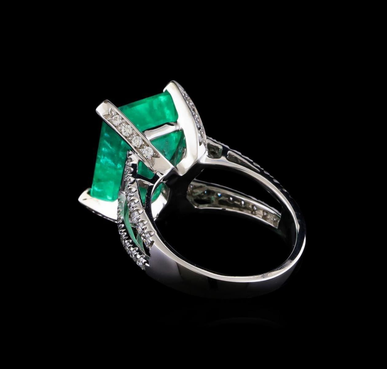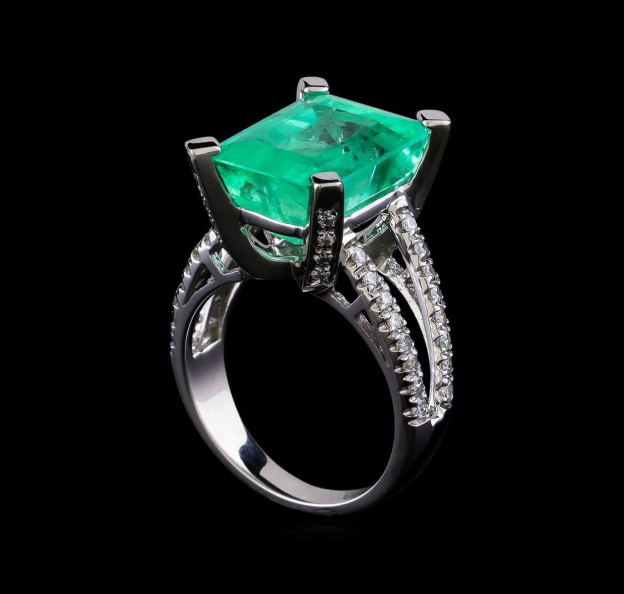 One electronically tested 14KT white gold lady's cast fashion ring with a split shank cathedral with a bright polish finish. The featured lady's ring has a shank measuring 3.02 millimeters in width. Identified with markings of "14K". Condition is new, good workmanship. Containing: One prong set emerald step cut natural emerald, measuring 14.04 x 10.23 x 7.80mm, (depth est.) 5%. bulge factor, approximate weight of 8.78ct., clarity is moderately included, medium light, moderately strong, green color, (GIA G 4/4), cut is good. Transmitting light with a minimum of distortion, transparent. Indications of oil residue. Naturally occurring internal & external characteristics are present. Colored gemstones are presumed to have been subjected to commonly used enhancement processes. Graded in the setting. Thirty-Two prong set round brilliant cut diamonds, measuring 1.57 - 1.52 x 0.97mm (depth est.) approximate total weight of 32 Stones = 0.45ct. Graded in the setting. Clarity: VS-2 to SI-1. Color: H - I. Cut Good Sixteen bead set round brilliant cut diamonds, measuring 1.40 - 1.35 x 0.86mm (depth est.) approximate total weight of 16 Stones = 0.16ct. Graded in the setting. Clarity: VS-2 to SI-2. Color: H - I. Cut Good. Total Weight of Colored Stones 8.78ct. Total Weight of Diamonds 0.61ct. Total Weight of Ring 8.20gm. GAS Appraised.