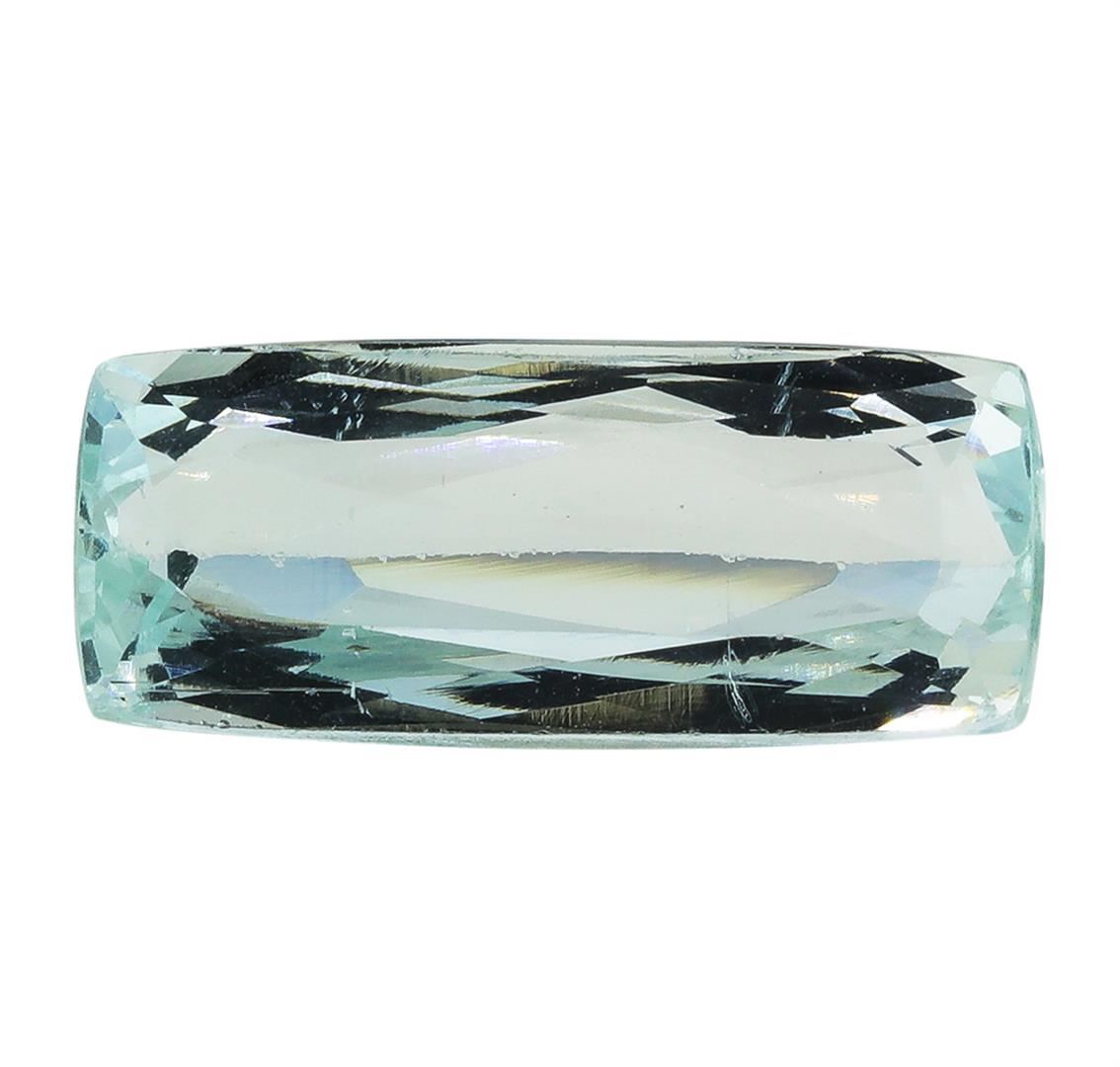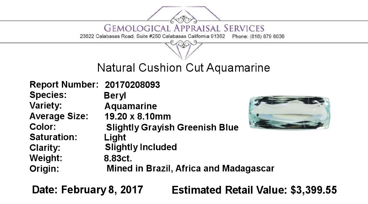 One natural cushion cut aquamarine with an exact weight of 8.83ct., clarity is slightly included, slightly grayish greenish blue, light. Gemological Appraisals Services estimates the retail value at $3399.55 GAS Appraised.