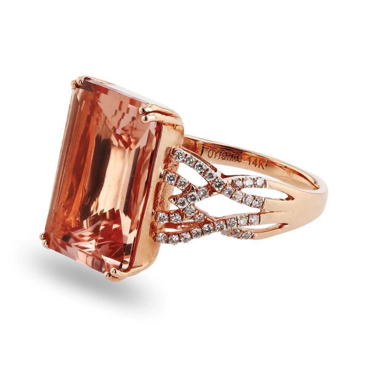 One electronically tested 14KT rose gold ladies cast morganite and diamond ring with a bright polish finish. Condition is new, good workmanship. The featured morganite is set within a rose gold basket supported by stylized diamond set shoulders, completed by a two millimeter wide band. Trademark is Orianne. Identified with markings of "14K". Containing: One prong set rectangular step cut natural morganite, measuring 16.90 x 11.00 x 7.00mm, approximate weight of 8.94ct., clarity is eye clean, type I, light, slightly brownish, red orange color, (GIA RO 3/2), cut is good. Transmitting light with no distortion, transparent. Graded in the setting. Sixty-six prong set round brilliant cut diamonds approximate total weight of 66 Stones = 0.35ct. Graded in the setting. Clarity SI-2 to I-2 Color F-H Total Weight of Colored Stones 8.94ct. Total Weight of Diamonds 0.35ct. Total Weight of Ring 6.81 gm