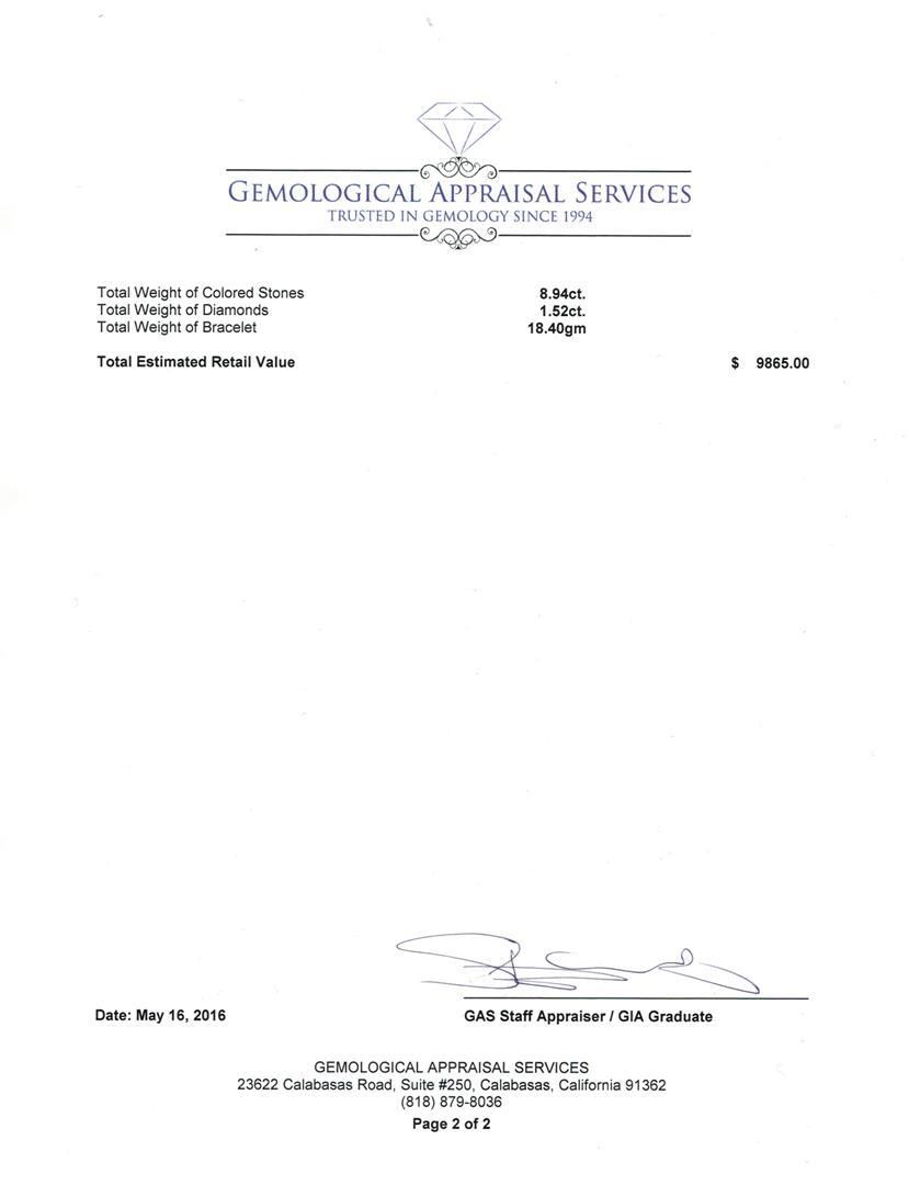 One electronically tested 14KT white gold lady's combination cast & assembled fashion bracelet with a double plunger clasp with a bright polish finish. The featured lady's bracelet measures approximately 7.5 inches in length. Identified with markings of "K14". Condition is new, good workmanship. Containing: Four prong set pear modified brilliant cut natural multi-color tourmalines, measuring 7.35 x 4.95 x 3.28mm, 15%. bulge factor, approximate total weight of 3.40ct., clarity is eye clean, cut is good. The featured tourmalines range in color from green to pink to orange. Transmitting light with no distortion, transparent. Colored gemstones are presumed to have been subjected to commonly used enhancement processes. Graded in the setting. Four prong set round modified brilliant cut natural multi-color tourmalines, measuring 5.80 - 5.45 x 3.30 mm, approximate total weight of 2.72ct., clarity is slightly included, cut is good. The featured tourmalines range in color from dark green to bluish green to pink to orange. Transmitting light with a minimum of distortion, transparent. Colored gemstones are presumed to have been subjected to commonly used enhancement processes. Graded in the setting. Three prong set square standard step cut natural multi-color tourmalines, measuring 5.70 x 5.20 x 3.60mm, 15%. bulge factor, approximate total weight of 2.82ct., clarity is slightly included, cut is good. The featured tourmalines range in color from green to pink to orangy red. Transmitting light with a minimum of distortion, transparent. Colored gemstones are presumed to have been subjected to commonly used enhancement processes. Graded in the setting. Two Hundred Forty-Eight prong set round brilliant cut diamonds, measuring 1.20 - 1.15 x 0.73mm (depth est.) approximate total weight of 248 Stones = 1.52ct. Graded in the setting. Clarity: SI-1 to SI-2. Color: H - I. Cut Good. Total Weight of Colored Stones 8.94ct. Total Weight of Diamonds 1.52ct. Total Weight of Bracelet 18.40gm. GAS Appraised.