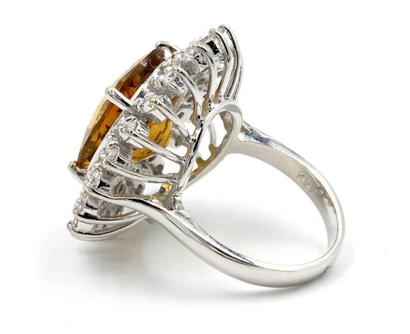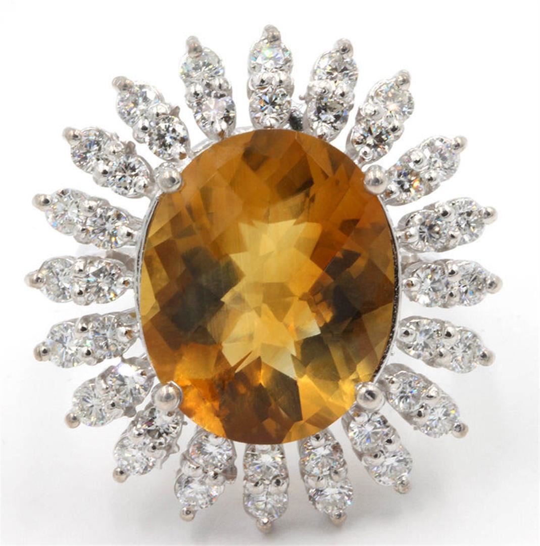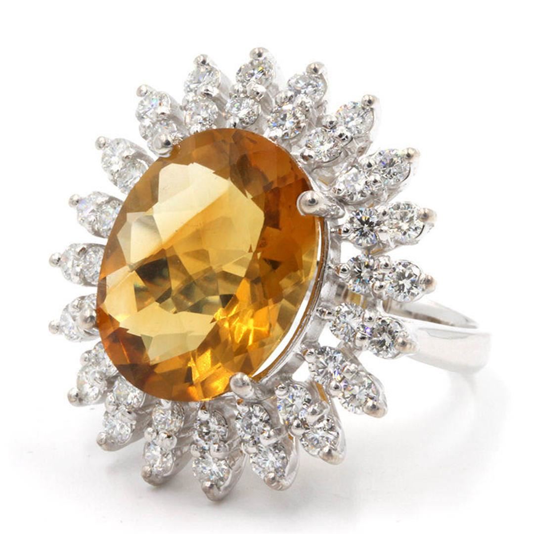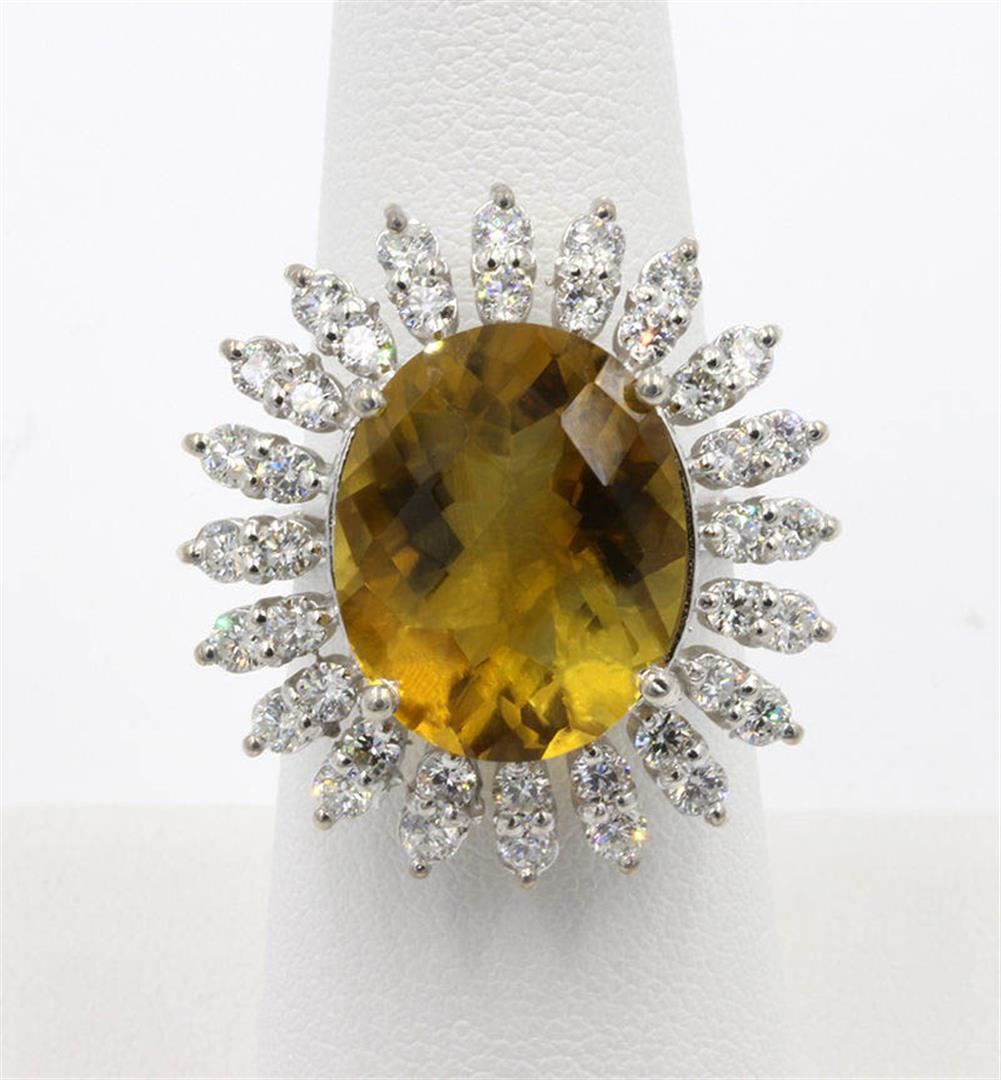 One lady's anniversary ring featuring: 14KT white gold weighing 8.65 grams containing one Madeira citrine weighing 9.00ct and 40 diamonds weighing 1.65ctw. The citring measures approximately 16.45mm x 13.30mm and is cut into and oval with fine medium clarity and orange color. The diamonds are round brilliant cut and are natural, unenhanced stones with SI-1 clarity, G-H color and excellent cut. The ring is size 6.25 but is resizable.